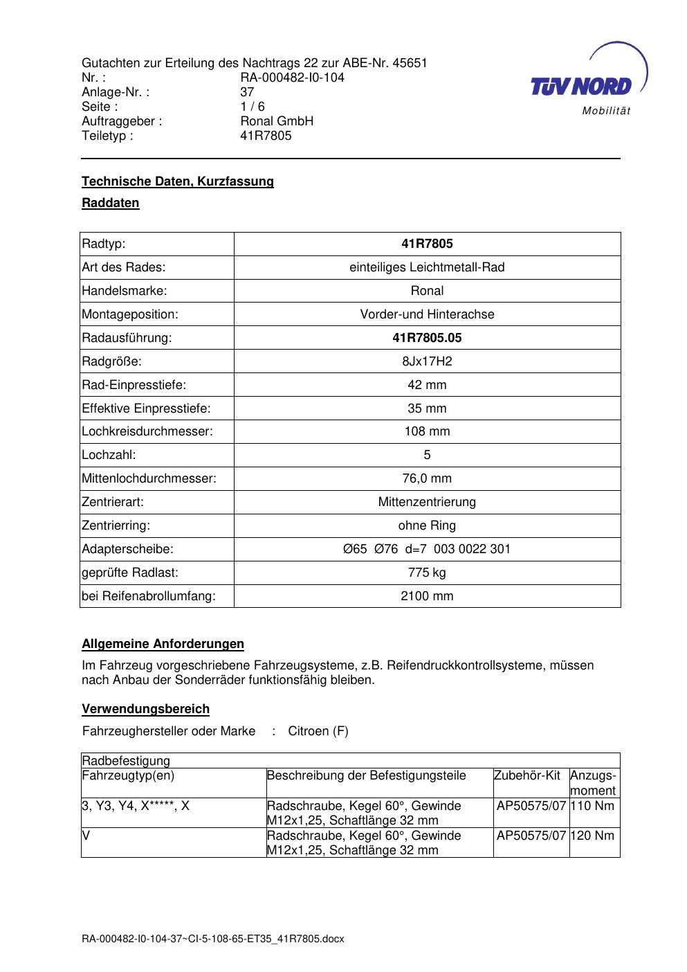 Dieses Gutachten (abe) bezieht sich auf die Alufelge brand-ronal 41R7805 in der Ausführung 8Jx17 ET 0, Mittenloch 0 mm (KBA 45651). Im PDF findest du typischerweise zulässige Reifengrößen, Auflagen/Anbauhinweise und – je nach Dokument – Hinweise zur Eintragung.