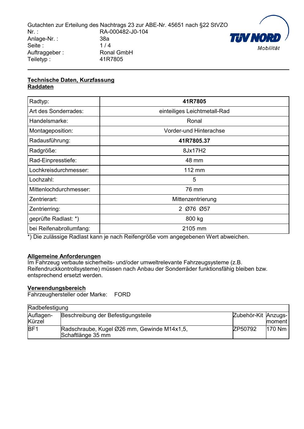 Dieses Gutachten (abe) bezieht sich auf die Alufelge brand-ronal 41R7805 in der Ausführung 8Jx17 ET 0, Mittenloch 0 mm (KBA 45651). Im PDF findest du typischerweise zulässige Reifengrößen, Auflagen/Anbauhinweise und – je nach Dokument – Hinweise zur Eintragung.