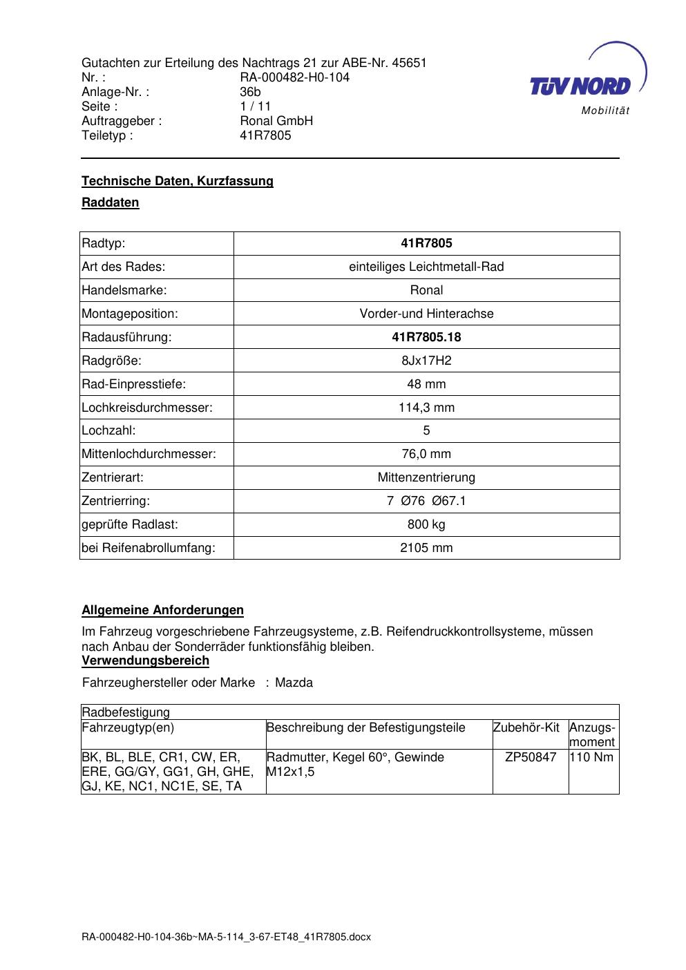 Dieses Gutachten (abe) bezieht sich auf die Alufelge brand-ronal 41R7805 in der Ausführung 8Jx17 ET 0, Mittenloch 0 mm (KBA 45651). Im PDF findest du typischerweise zulässige Reifengrößen, Auflagen/Anbauhinweise und – je nach Dokument – Hinweise zur Eintragung.