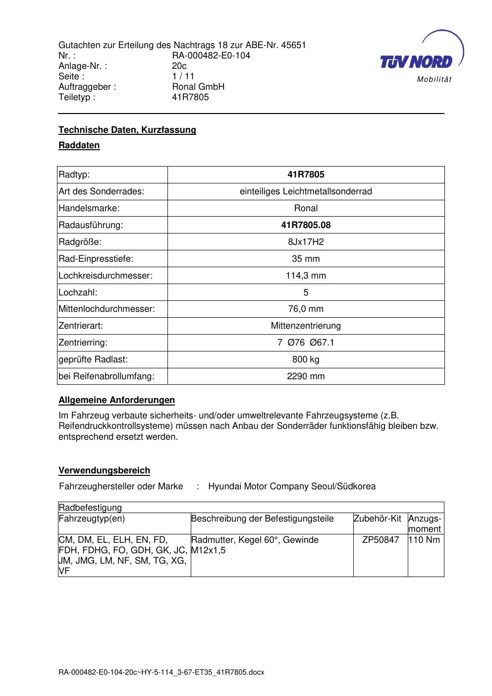 Dieses Gutachten (abe) bezieht sich auf die Alufelge brand-ronal 41R7805 in der Ausführung 8Jx17 ET 0, Mittenloch 0 mm (KBA 45651). Im PDF findest du typischerweise zulässige Reifengrößen, Auflagen/Anbauhinweise und – je nach Dokument – Hinweise zur Eintragung.