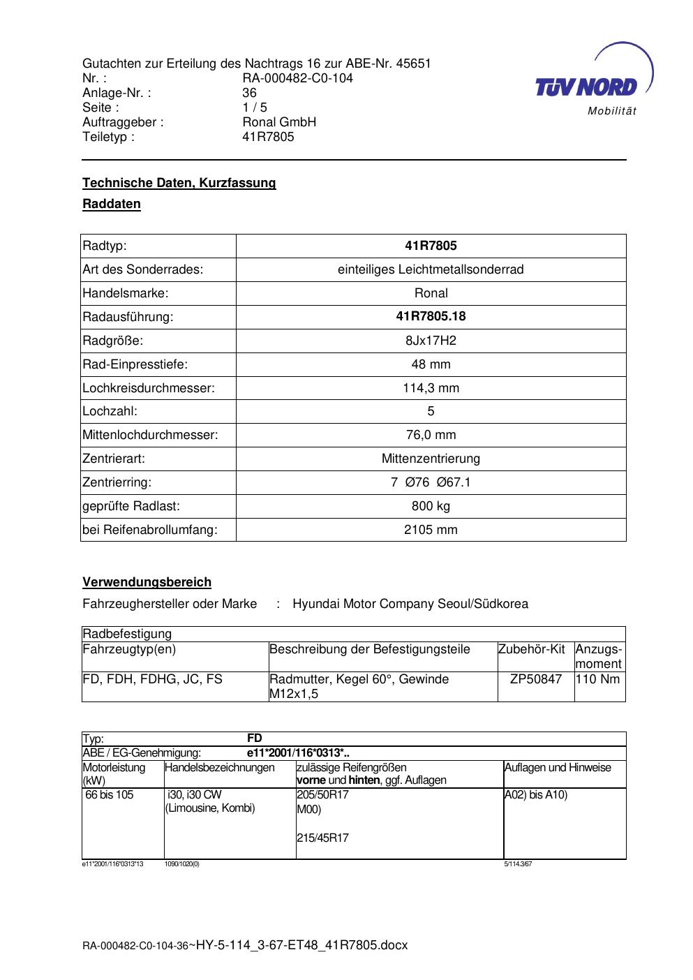 Dieses Gutachten (abe) bezieht sich auf die Alufelge brand-ronal 41R7805 in der Ausführung 8Jx17 ET 0, Mittenloch 0 mm (KBA 45651). Im PDF findest du typischerweise zulässige Reifengrößen, Auflagen/Anbauhinweise und – je nach Dokument – Hinweise zur Eintragung.