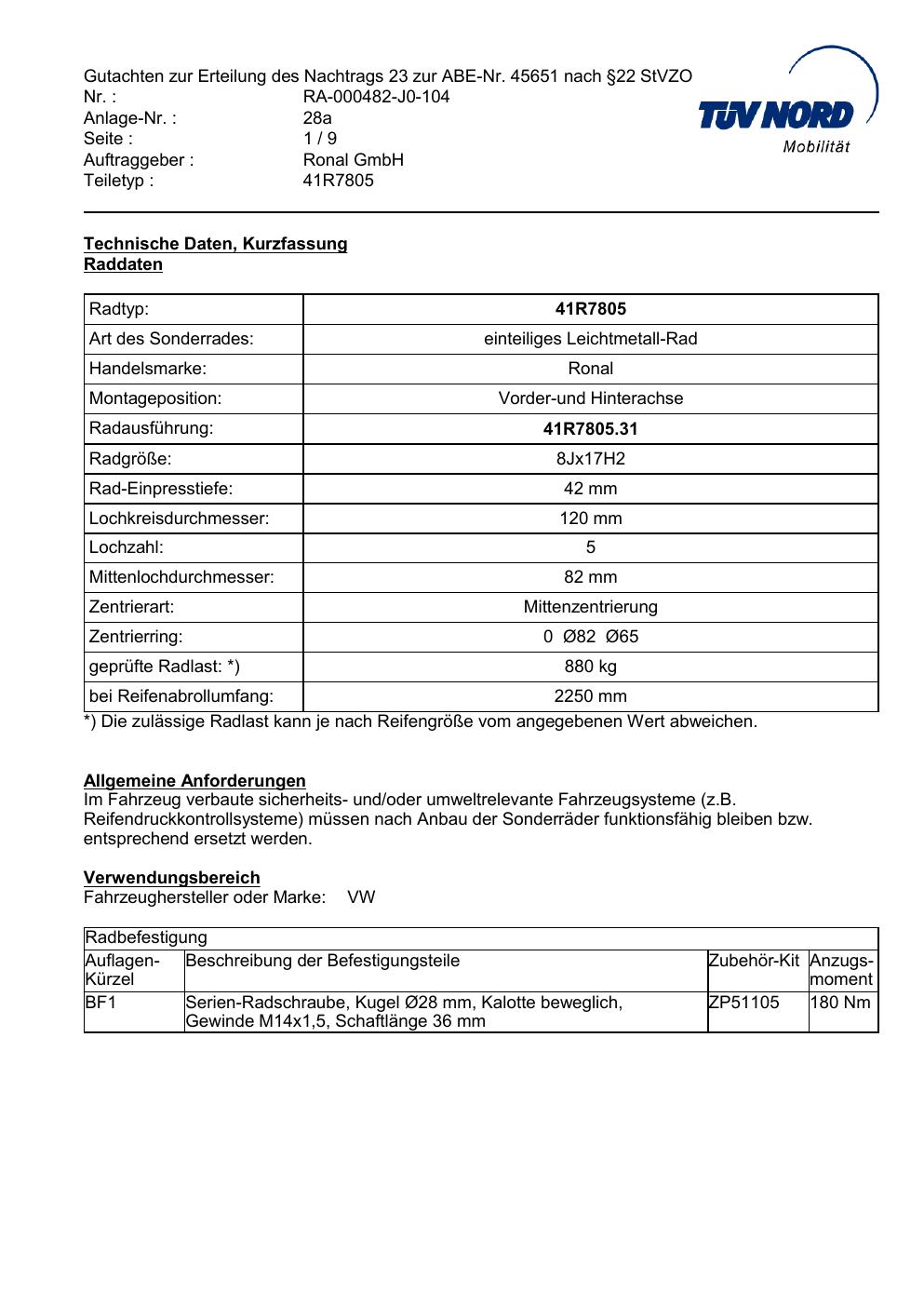 Dieses Gutachten (abe) bezieht sich auf die Alufelge brand-ronal 41R7805 in der Ausführung 8Jx17 ET 0, Mittenloch 0 mm (KBA 45651). Im PDF findest du typischerweise zulässige Reifengrößen, Auflagen/Anbauhinweise und – je nach Dokument – Hinweise zur Eintragung.