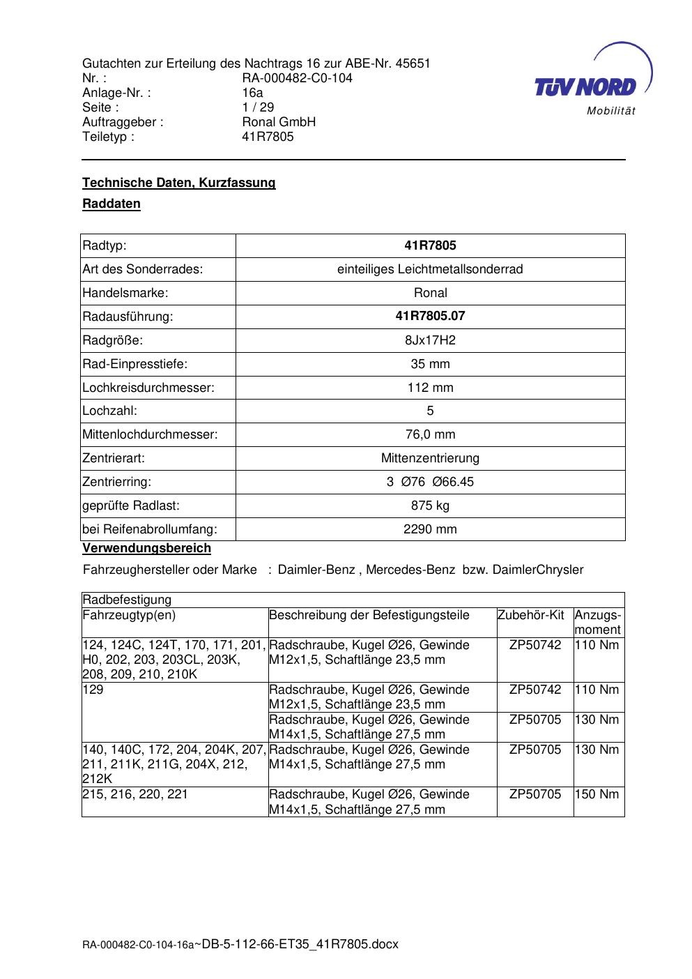 Dieses Gutachten (abe) bezieht sich auf die Alufelge brand-ronal 41R7805 in der Ausführung 8Jx17 ET 0, Mittenloch 0 mm (KBA 45651). Im PDF findest du typischerweise zulässige Reifengrößen, Auflagen/Anbauhinweise und – je nach Dokument – Hinweise zur Eintragung.