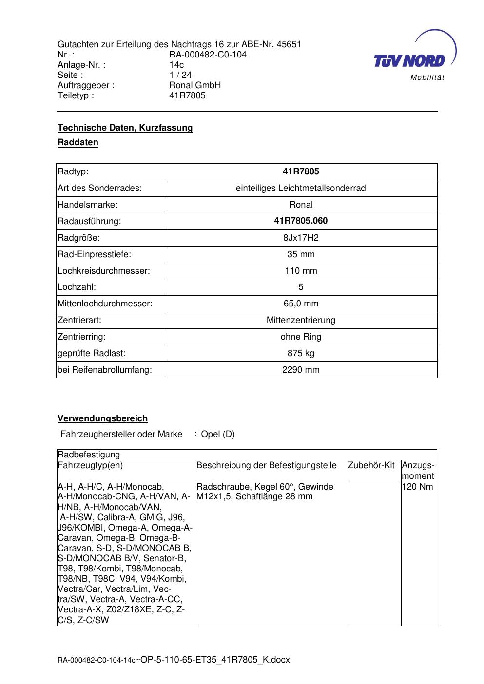 Dieses Gutachten (abe) bezieht sich auf die Alufelge brand-ronal 41R7805 in der Ausführung 8Jx17 ET 0, Mittenloch 0 mm (KBA 45651). Im PDF findest du typischerweise zulässige Reifengrößen, Auflagen/Anbauhinweise und – je nach Dokument – Hinweise zur Eintragung.