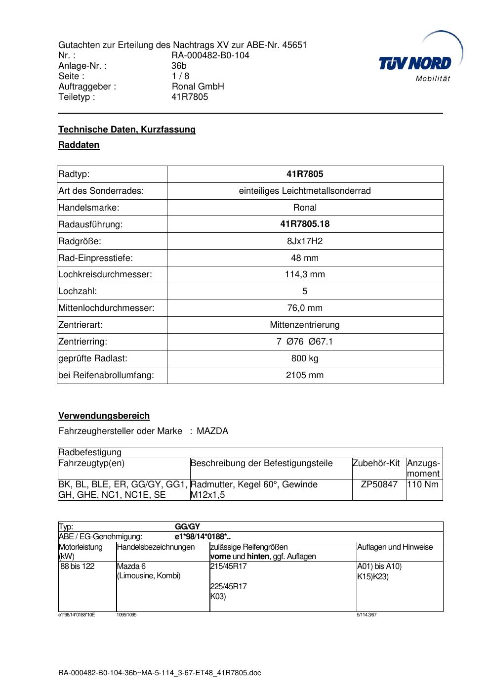 Dieses Gutachten (abe) bezieht sich auf die Alufelge brand-ronal 41R7805 in der Ausführung 8Jx17 ET 0, Mittenloch 0 mm (KBA 45651). Im PDF findest du typischerweise zulässige Reifengrößen, Auflagen/Anbauhinweise und – je nach Dokument – Hinweise zur Eintragung.