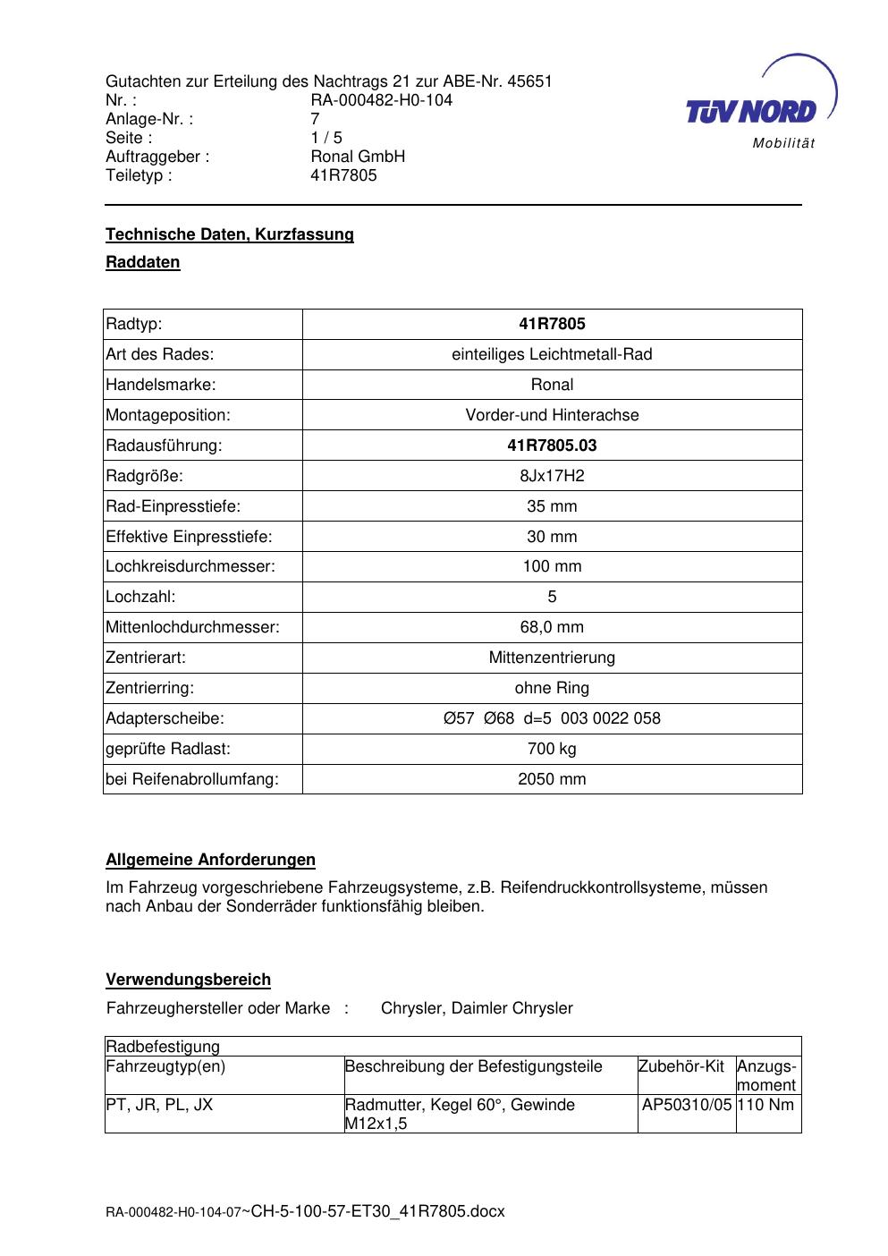 Dieses Gutachten (abe) bezieht sich auf die Alufelge brand-ronal 41R7805 in der Ausführung 8Jx17 ET 0, Mittenloch 0 mm (KBA 45651). Im PDF findest du typischerweise zulässige Reifengrößen, Auflagen/Anbauhinweise und – je nach Dokument – Hinweise zur Eintragung.