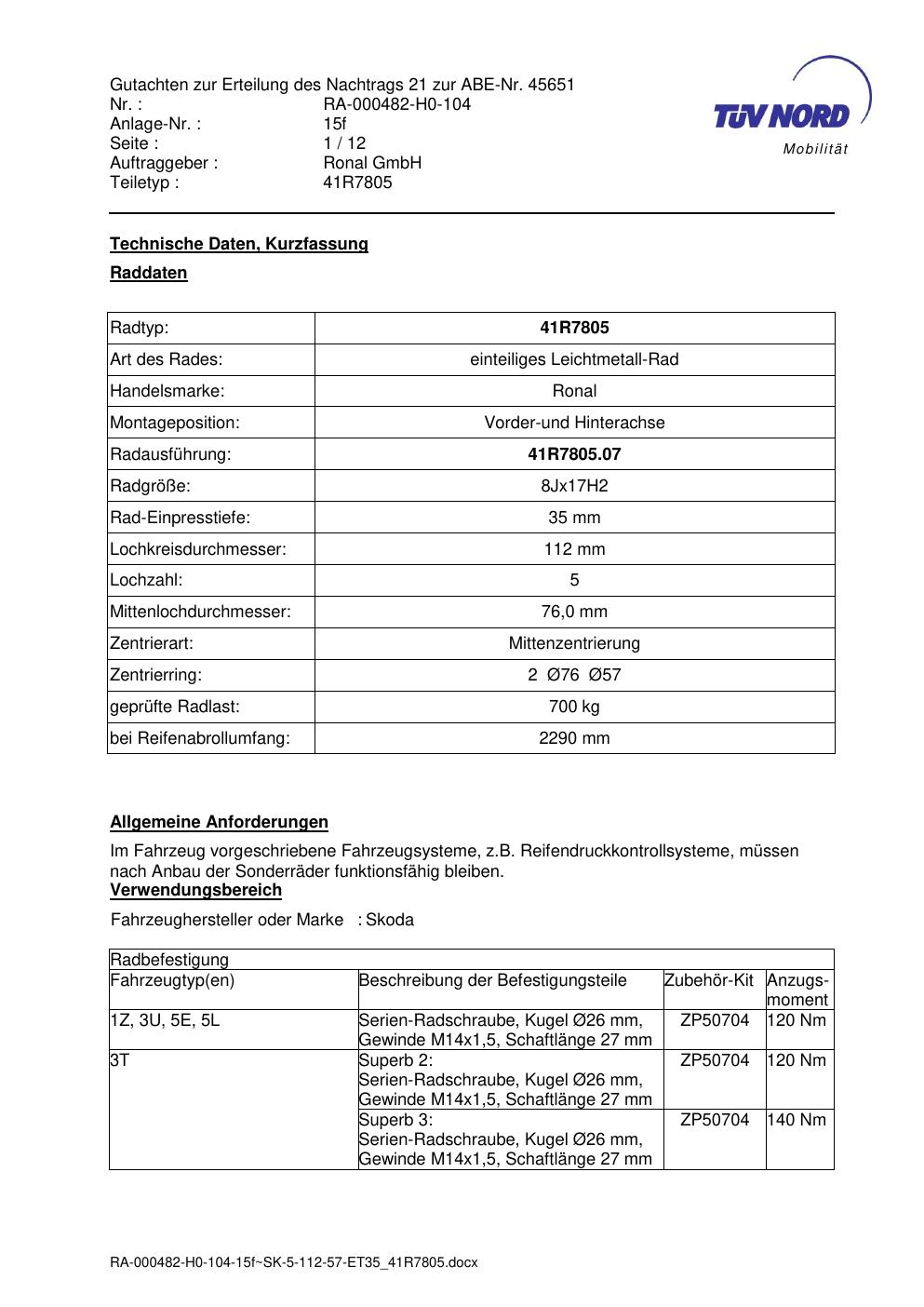 Dieses Gutachten (abe) bezieht sich auf die Alufelge brand-ronal 41R7805 in der Ausführung 8Jx17 ET 0, Mittenloch 0 mm (KBA 45651). Im PDF findest du typischerweise zulässige Reifengrößen, Auflagen/Anbauhinweise und – je nach Dokument – Hinweise zur Eintragung.
