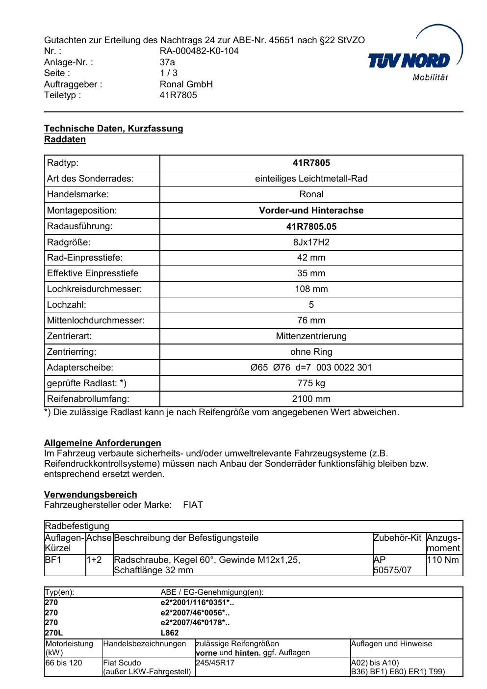 Dieses Gutachten (abe) bezieht sich auf die Alufelge brand-ronal 41R7805 in der Ausführung 8Jx17 ET 0, Mittenloch 0 mm (KBA 45651). Im PDF findest du typischerweise zulässige Reifengrößen, Auflagen/Anbauhinweise und – je nach Dokument – Hinweise zur Eintragung.