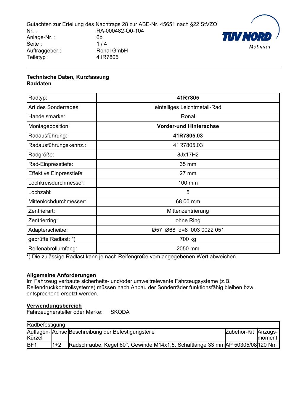 Dieses Gutachten (abe) bezieht sich auf die Alufelge brand-ronal 41R7805 in der Ausführung 8Jx17 ET 0, Mittenloch 0 mm (KBA 45651). Im PDF findest du typischerweise zulässige Reifengrößen, Auflagen/Anbauhinweise und – je nach Dokument – Hinweise zur Eintragung.