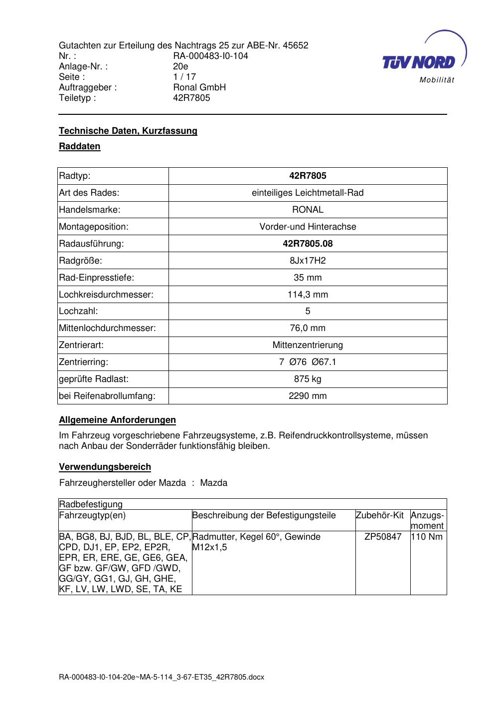 Dieses Gutachten (abe) bezieht sich auf die Alufelge brand-rial 42R7805 in der Ausführung 8Jx17 ET 0, Mittenloch 0 mm (KBA 45652). Im PDF findest du typischerweise zulässige Reifengrößen, Auflagen/Anbauhinweise und – je nach Dokument – Hinweise zur Eintragung.