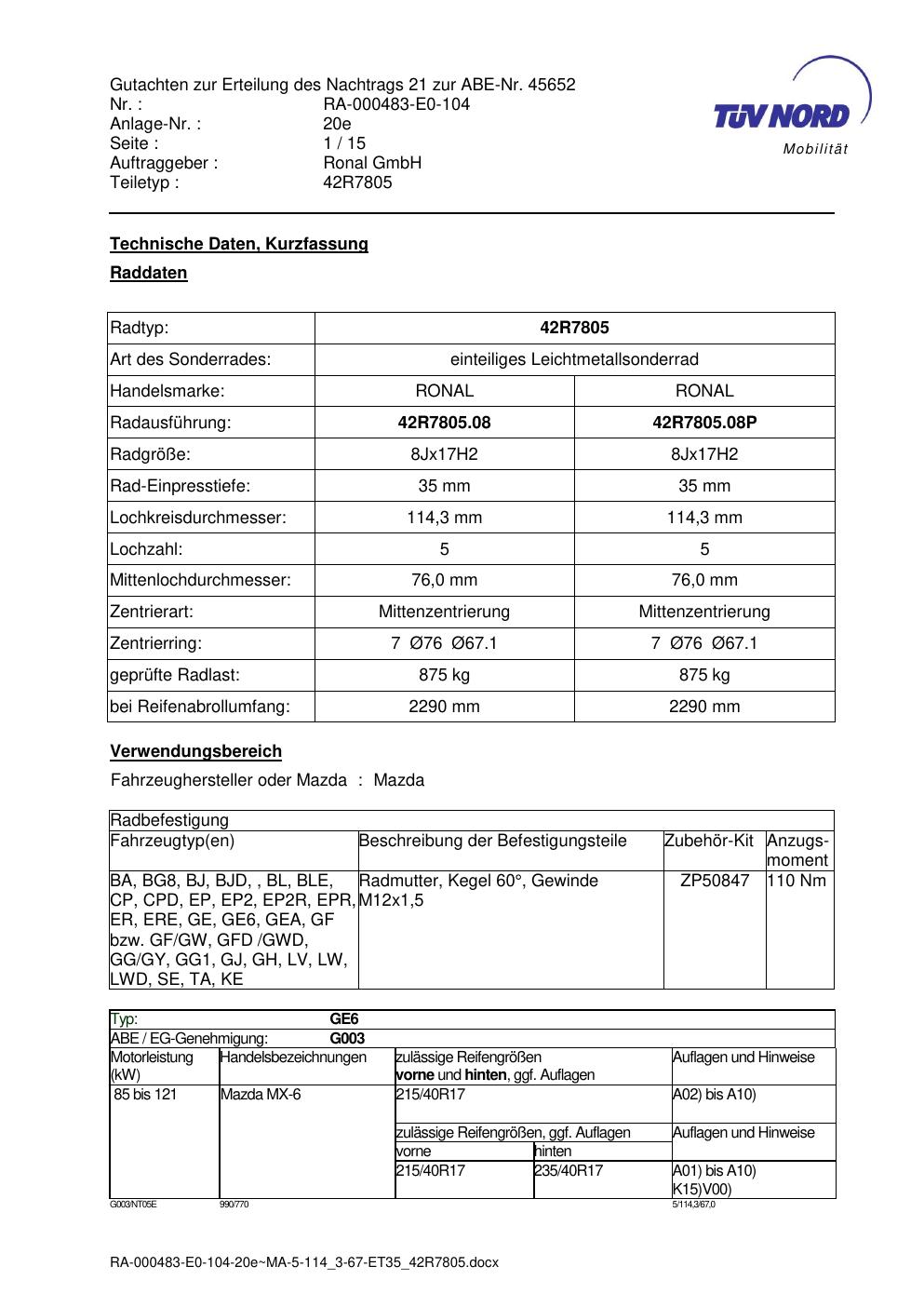 Dieses Gutachten (abe) bezieht sich auf die Alufelge brand-rial 42R7805 in der Ausführung 8Jx17 ET 0, Mittenloch 0 mm (KBA 45652). Im PDF findest du typischerweise zulässige Reifengrößen, Auflagen/Anbauhinweise und – je nach Dokument – Hinweise zur Eintragung.