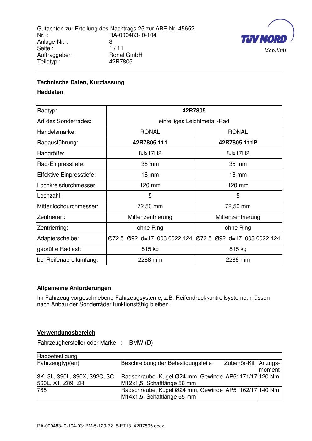 Dieses Gutachten (abe) bezieht sich auf die Alufelge brand-ronal 42R7805 in der Ausführung 8Jx17 ET 0, Mittenloch 0 mm (KBA 45652). Im PDF findest du typischerweise zulässige Reifengrößen, Auflagen/Anbauhinweise und – je nach Dokument – Hinweise zur Eintragung.