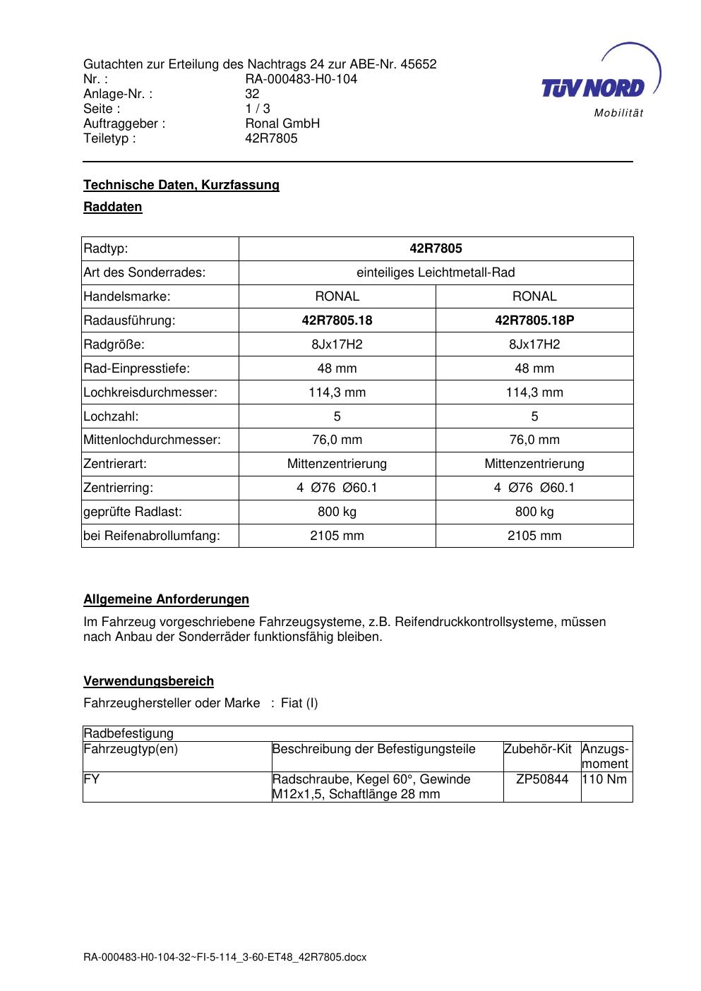 Dieses Gutachten (abe) bezieht sich auf die Alufelge brand-ronal 42R7805 in der Ausführung 8Jx17 ET 0, Mittenloch 0 mm (KBA 45652). Im PDF findest du typischerweise zulässige Reifengrößen, Auflagen/Anbauhinweise und – je nach Dokument – Hinweise zur Eintragung.
