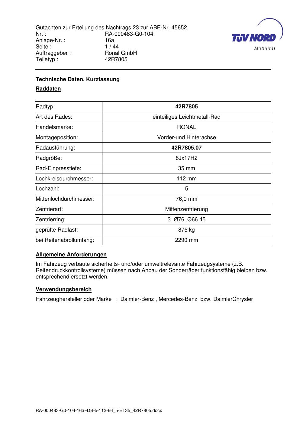 Dieses Gutachten (abe) bezieht sich auf die Alufelge brand-ronal 42R7805 in der Ausführung 8Jx17 ET 0, Mittenloch 0 mm (KBA 45652). Im PDF findest du typischerweise zulässige Reifengrößen, Auflagen/Anbauhinweise und – je nach Dokument – Hinweise zur Eintragung.