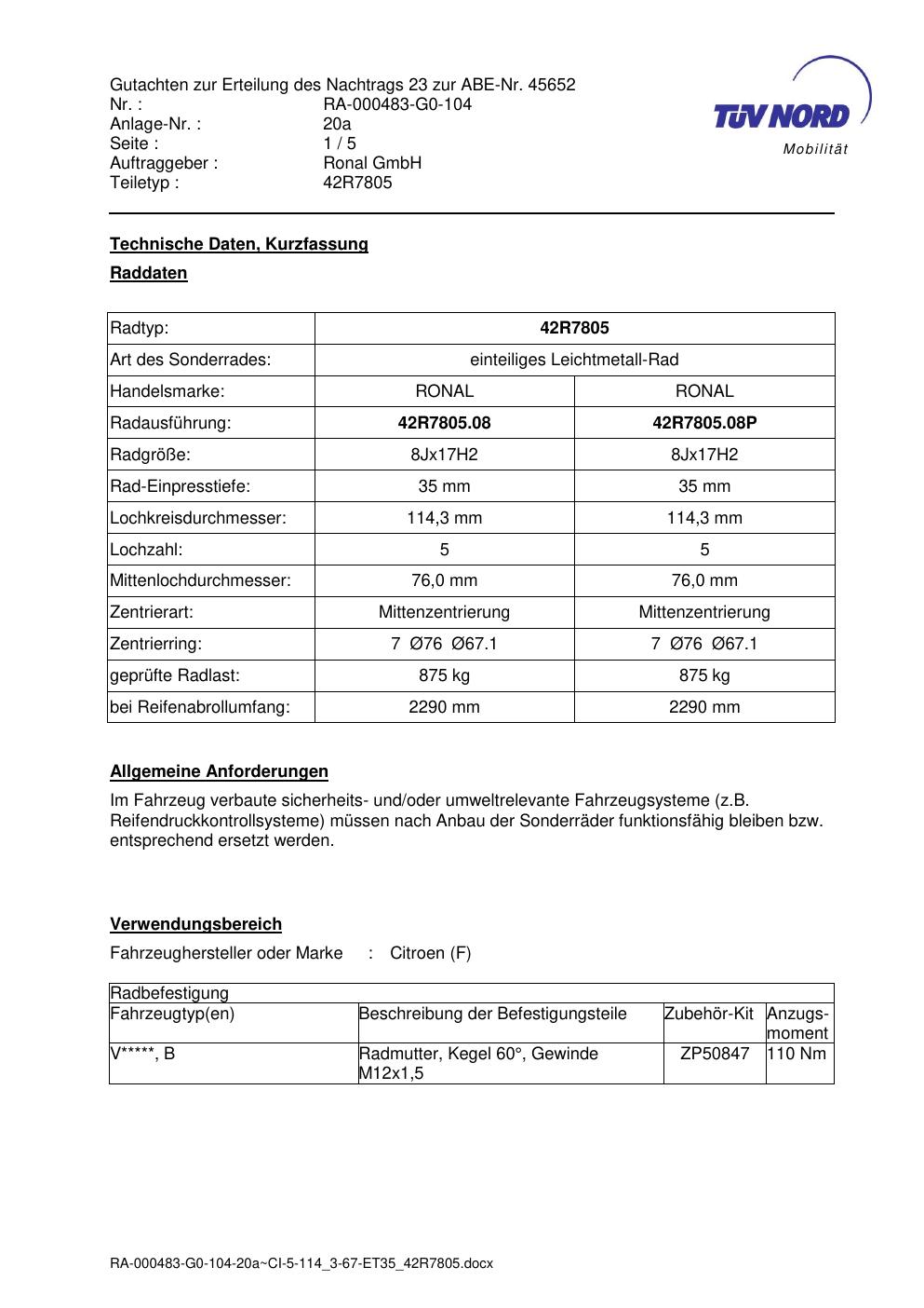 Dieses Gutachten (abe) bezieht sich auf die Alufelge brand-ronal 42R7805 in der Ausführung 8Jx17 ET 0, Mittenloch 0 mm (KBA 45652). Im PDF findest du typischerweise zulässige Reifengrößen, Auflagen/Anbauhinweise und – je nach Dokument – Hinweise zur Eintragung.