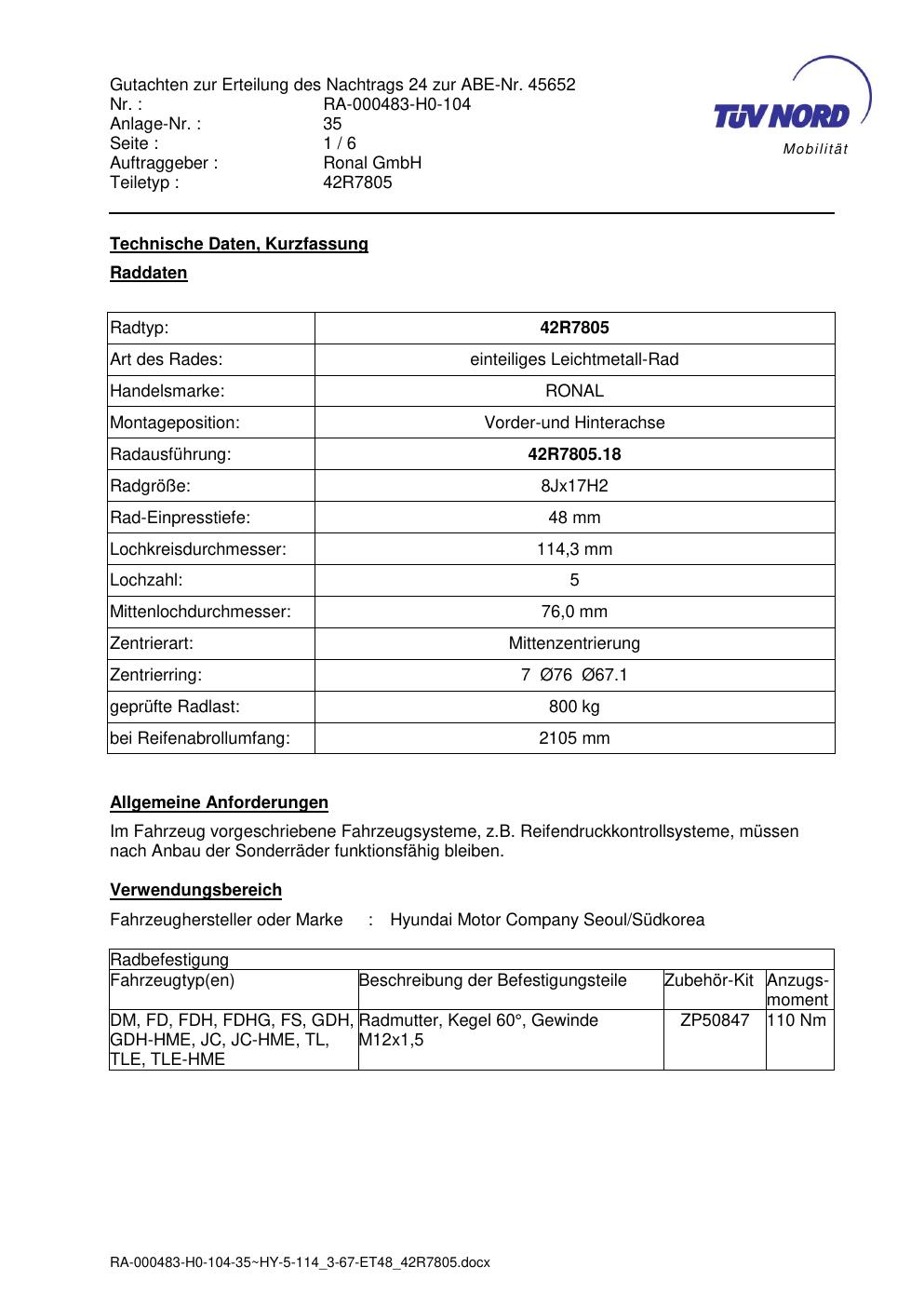 Dieses Gutachten (abe) bezieht sich auf die Alufelge brand-ronal 42R7805 in der Ausführung 8Jx17 ET 0, Mittenloch 0 mm (KBA 45652). Im PDF findest du typischerweise zulässige Reifengrößen, Auflagen/Anbauhinweise und – je nach Dokument – Hinweise zur Eintragung.