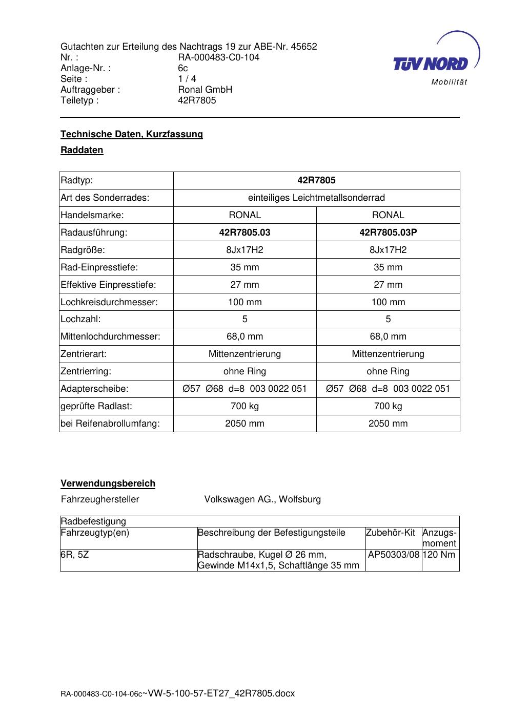 Dieses Gutachten (abe) bezieht sich auf die Alufelge brand-ronal 42R7805 in der Ausführung 8Jx17 ET 0, Mittenloch 0 mm (KBA 45652). Im PDF findest du typischerweise zulässige Reifengrößen, Auflagen/Anbauhinweise und – je nach Dokument – Hinweise zur Eintragung.