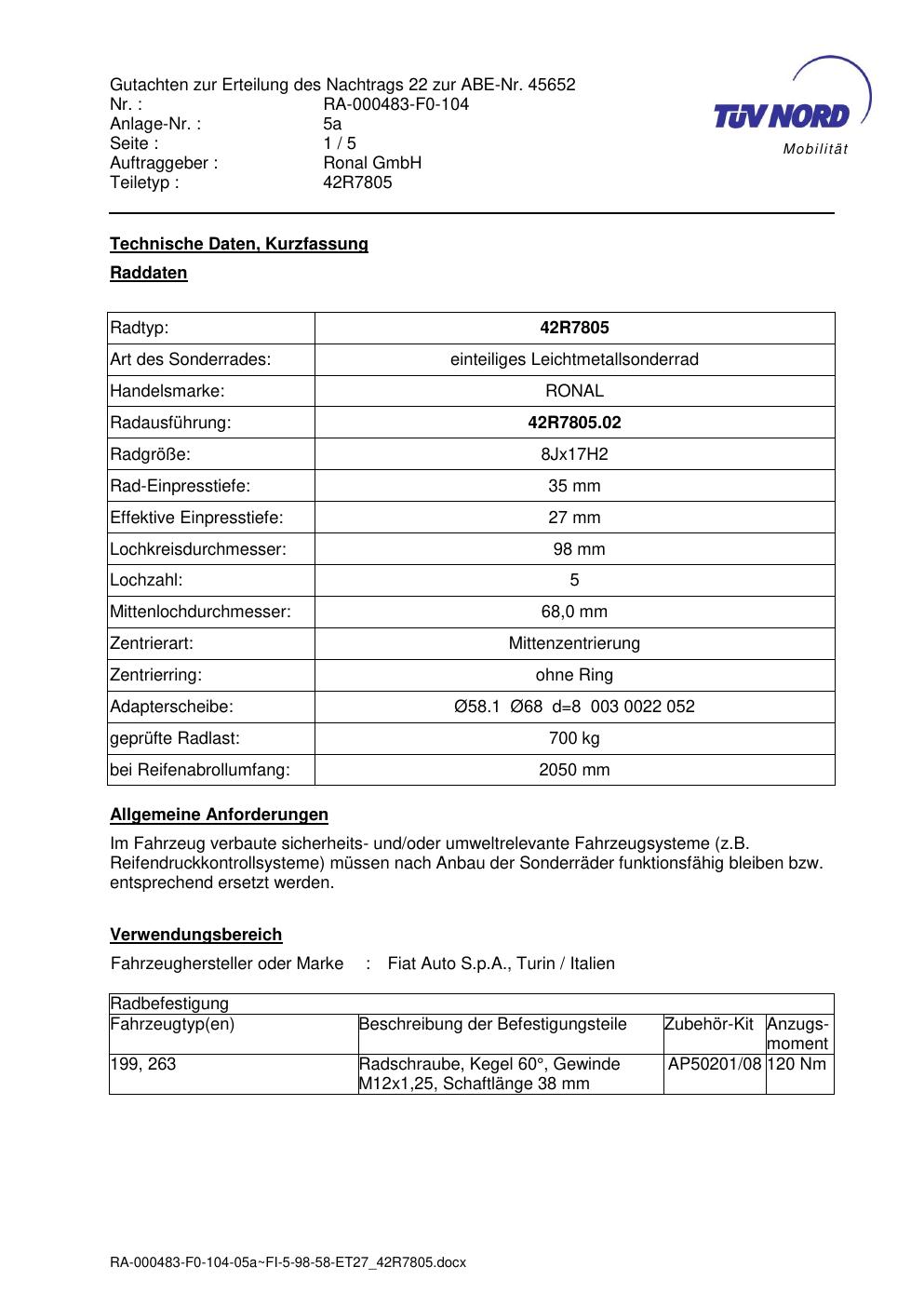 Dieses Gutachten (abe) bezieht sich auf die Alufelge brand-ronal 42R7805 in der Ausführung 8Jx17 ET 0, Mittenloch 0 mm (KBA 45652). Im PDF findest du typischerweise zulässige Reifengrößen, Auflagen/Anbauhinweise und – je nach Dokument – Hinweise zur Eintragung.