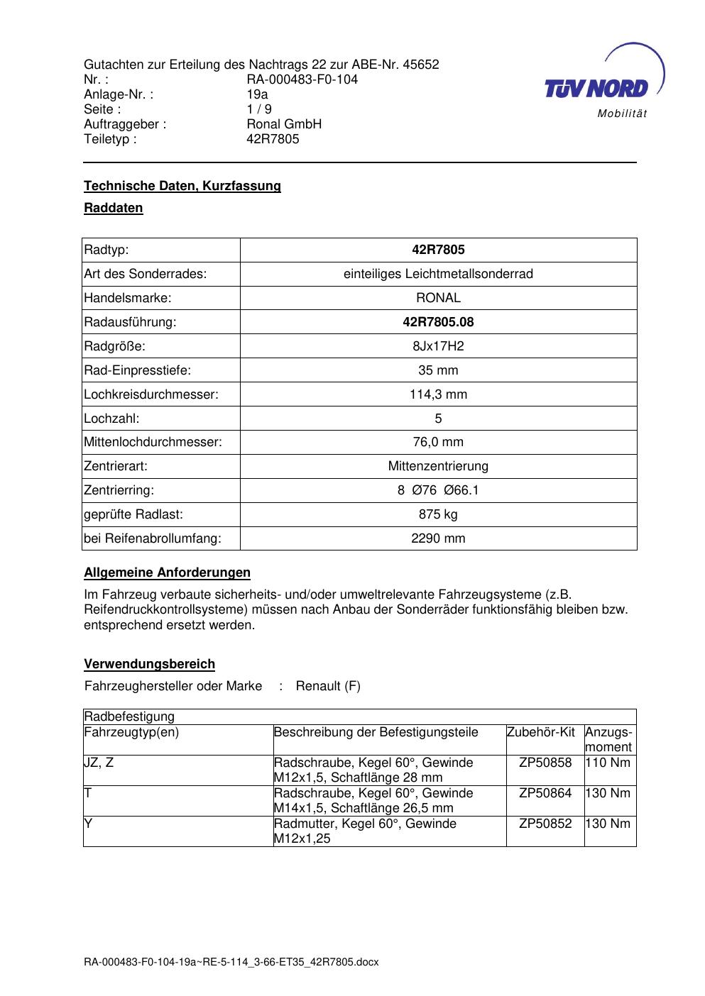Dieses Gutachten (abe) bezieht sich auf die Alufelge brand-ronal 42R7805 in der Ausführung 8Jx17 ET 0, Mittenloch 0 mm (KBA 45652). Im PDF findest du typischerweise zulässige Reifengrößen, Auflagen/Anbauhinweise und – je nach Dokument – Hinweise zur Eintragung.