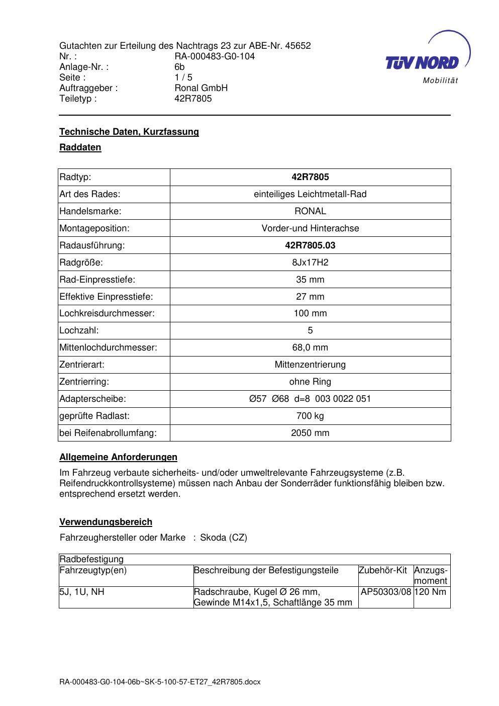 Dieses Gutachten (abe) bezieht sich auf die Alufelge brand-ronal 42R7805 in der Ausführung 8Jx17 ET 0, Mittenloch 0 mm (KBA 45652). Im PDF findest du typischerweise zulässige Reifengrößen, Auflagen/Anbauhinweise und – je nach Dokument – Hinweise zur Eintragung.
