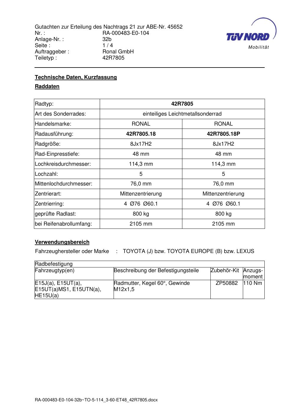 Dieses Gutachten (abe) bezieht sich auf die Alufelge brand-ronal 42R7805 in der Ausführung 8Jx17 ET 0, Mittenloch 0 mm (KBA 45652). Im PDF findest du typischerweise zulässige Reifengrößen, Auflagen/Anbauhinweise und – je nach Dokument – Hinweise zur Eintragung.