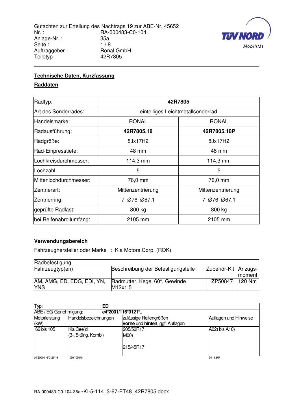 Dieses Gutachten (abe) bezieht sich auf die Alufelge brand-ronal 42R7805 in der Ausführung 8Jx17 ET 0, Mittenloch 0 mm (KBA 45652). Im PDF findest du typischerweise zulässige Reifengrößen, Auflagen/Anbauhinweise und – je nach Dokument – Hinweise zur Eintragung.