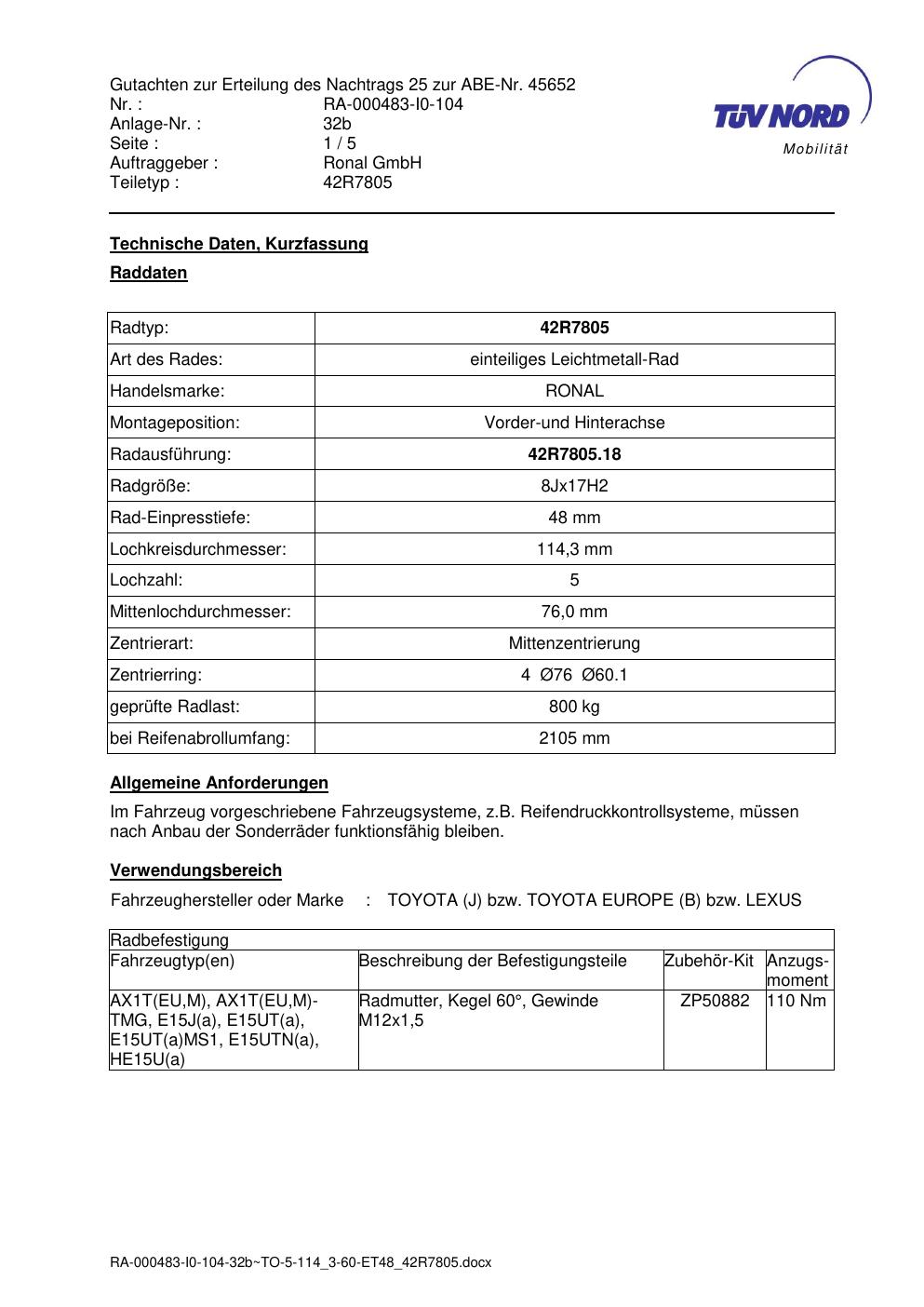 Dieses Gutachten (abe) bezieht sich auf die Alufelge brand-ronal 42R7805 in der Ausführung 8Jx17 ET 0, Mittenloch 0 mm (KBA 45652). Im PDF findest du typischerweise zulässige Reifengrößen, Auflagen/Anbauhinweise und – je nach Dokument – Hinweise zur Eintragung.