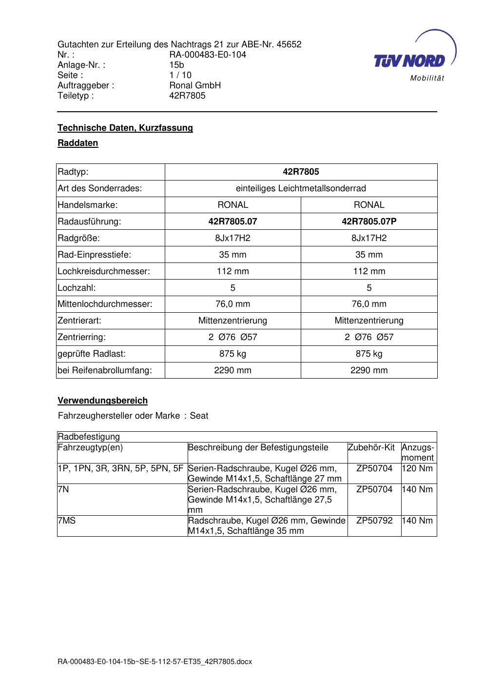 Dieses Gutachten (abe) bezieht sich auf die Alufelge brand-ronal 42R7805 in der Ausführung 8Jx17 ET 0, Mittenloch 0 mm (KBA 45652). Im PDF findest du typischerweise zulässige Reifengrößen, Auflagen/Anbauhinweise und – je nach Dokument – Hinweise zur Eintragung.