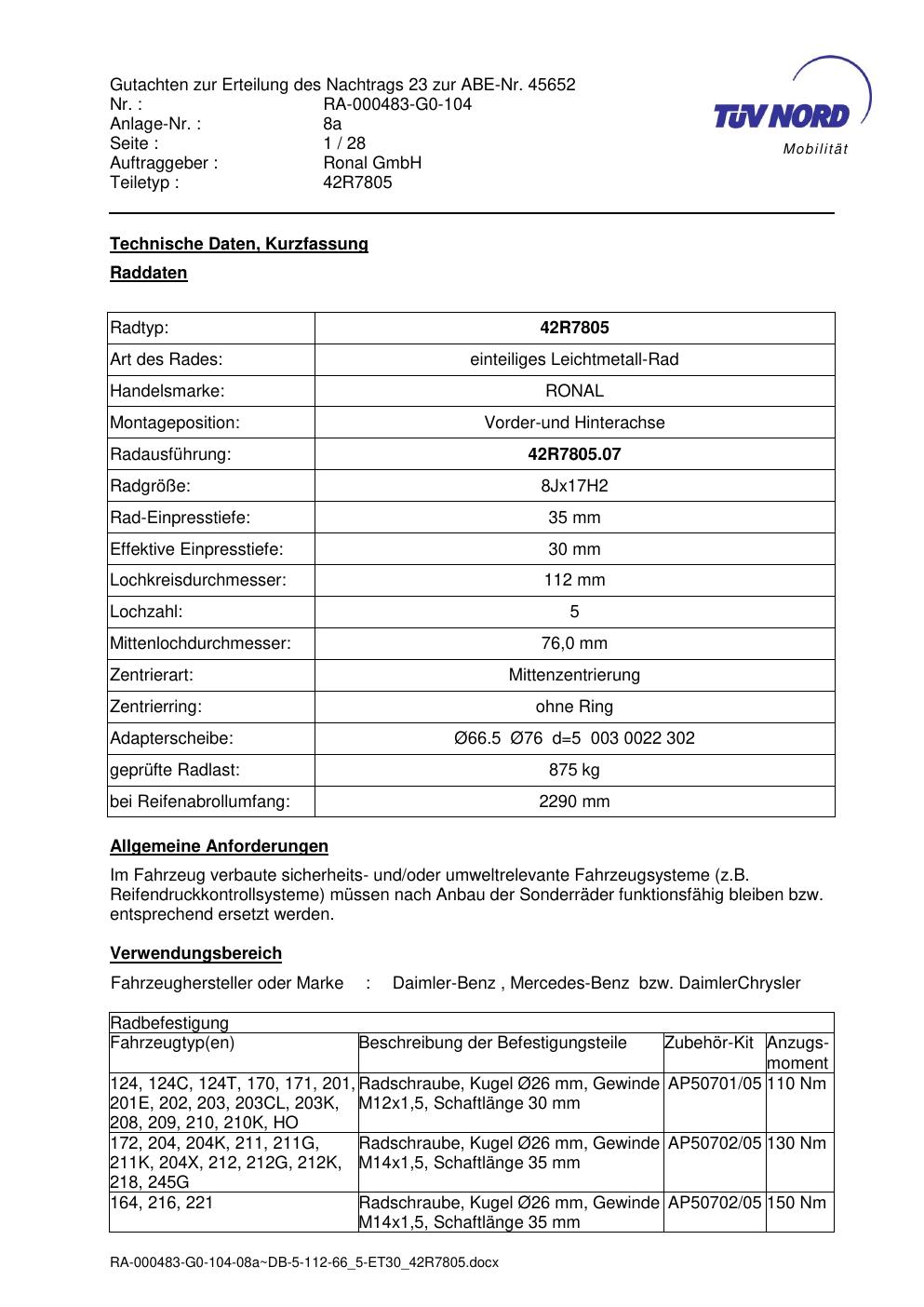 Dieses Gutachten (abe) bezieht sich auf die Alufelge brand-ronal 42R7805 in der Ausführung 8Jx17 ET 0, Mittenloch 0 mm (KBA 45652). Im PDF findest du typischerweise zulässige Reifengrößen, Auflagen/Anbauhinweise und – je nach Dokument – Hinweise zur Eintragung.