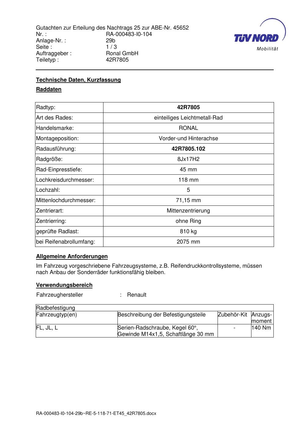 Dieses Gutachten (abe) bezieht sich auf die Alufelge brand-ronal 42R7805 in der Ausführung 8Jx17 ET 0, Mittenloch 0 mm (KBA 45652). Im PDF findest du typischerweise zulässige Reifengrößen, Auflagen/Anbauhinweise und – je nach Dokument – Hinweise zur Eintragung.
