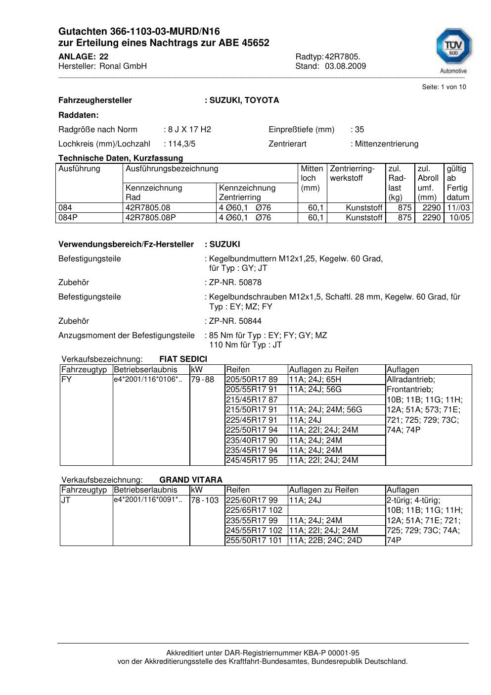 Dieses Gutachten (abe) bezieht sich auf die Alufelge Ronal 42R7805 in der Ausführung 8Jx17 ET 0, Mittenloch 0 mm (KBA 45652). Im PDF findest du typischerweise zulässige Reifengrößen, Auflagen/Anbauhinweise und – je nach Dokument – Hinweise zur Eintragung.