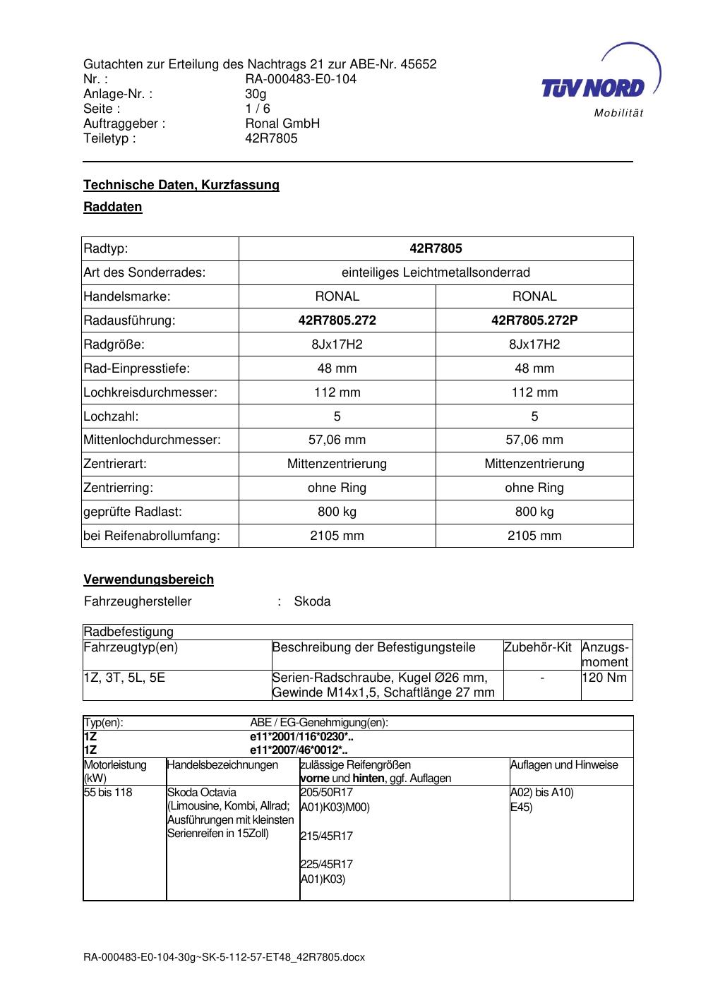 Dieses Gutachten (abe) bezieht sich auf die Alufelge brand-ronal 42R7805 in der Ausführung 8Jx17 ET 0, Mittenloch 0 mm (KBA 45652). Im PDF findest du typischerweise zulässige Reifengrößen, Auflagen/Anbauhinweise und – je nach Dokument – Hinweise zur Eintragung.