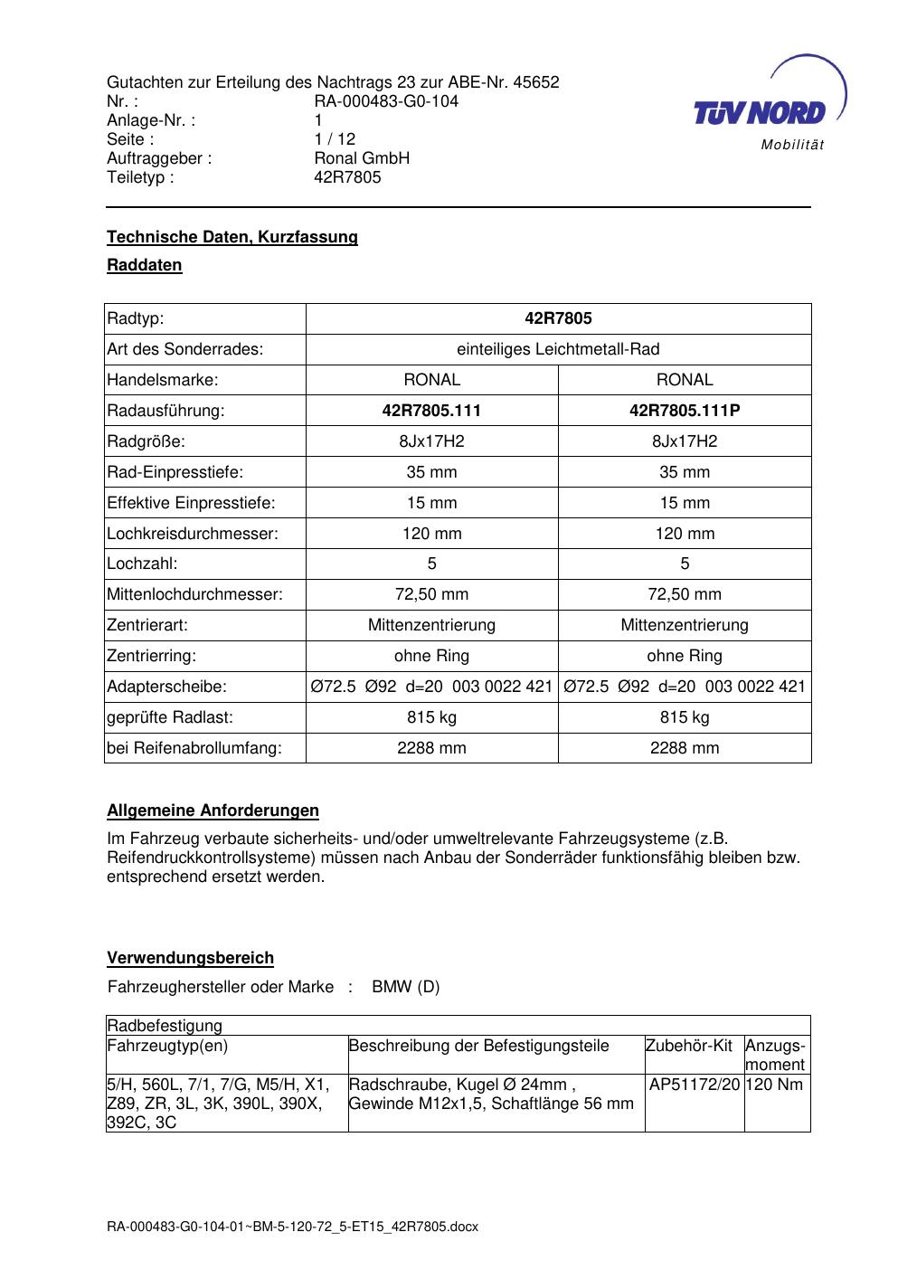 Dieses Gutachten (abe) bezieht sich auf die Alufelge brand-ronal 42R7805 in der Ausführung 8Jx17 ET 0, Mittenloch 0 mm (KBA 45652). Im PDF findest du typischerweise zulässige Reifengrößen, Auflagen/Anbauhinweise und – je nach Dokument – Hinweise zur Eintragung.