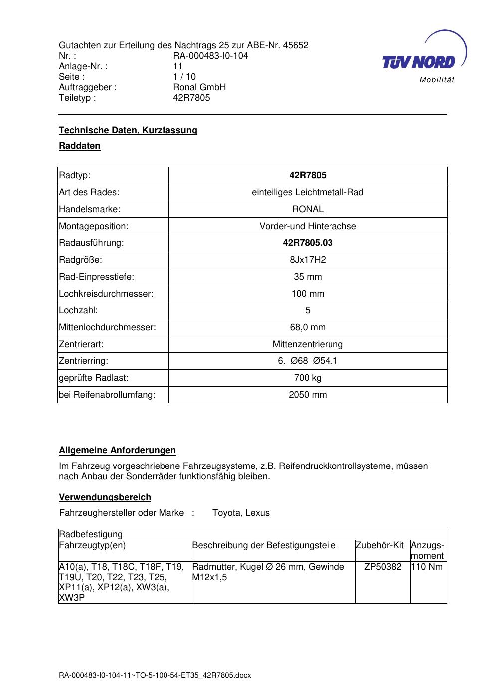 Dieses Gutachten (abe) bezieht sich auf die Alufelge brand-ronal 42R7805 in der Ausführung 8Jx17 ET 0, Mittenloch 0 mm (KBA 45652). Im PDF findest du typischerweise zulässige Reifengrößen, Auflagen/Anbauhinweise und – je nach Dokument – Hinweise zur Eintragung.