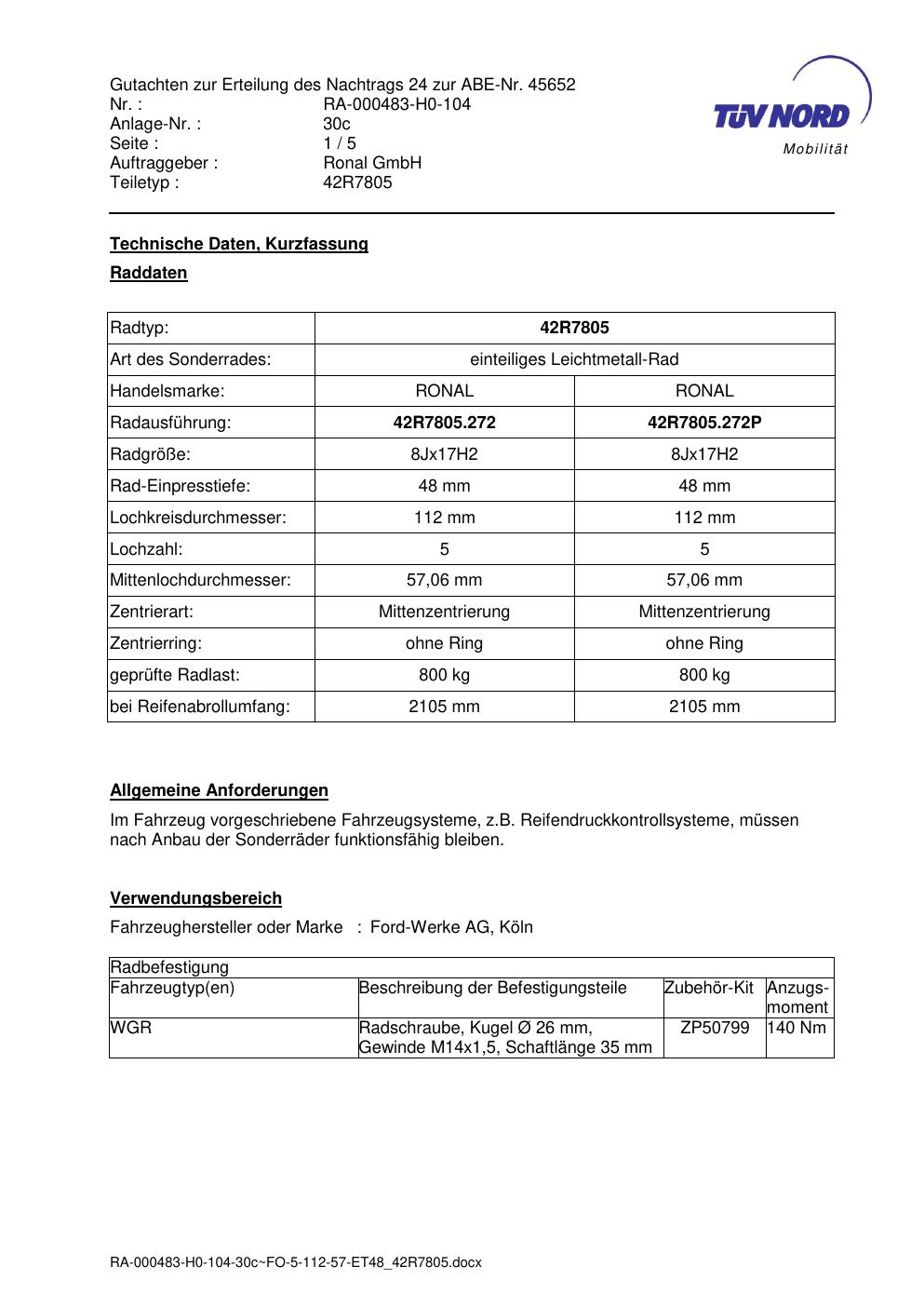 Dieses Gutachten (abe) bezieht sich auf die Alufelge brand-ronal 42R7805 in der Ausführung 8Jx17 ET 0, Mittenloch 0 mm (KBA 45652). Im PDF findest du typischerweise zulässige Reifengrößen, Auflagen/Anbauhinweise und – je nach Dokument – Hinweise zur Eintragung.