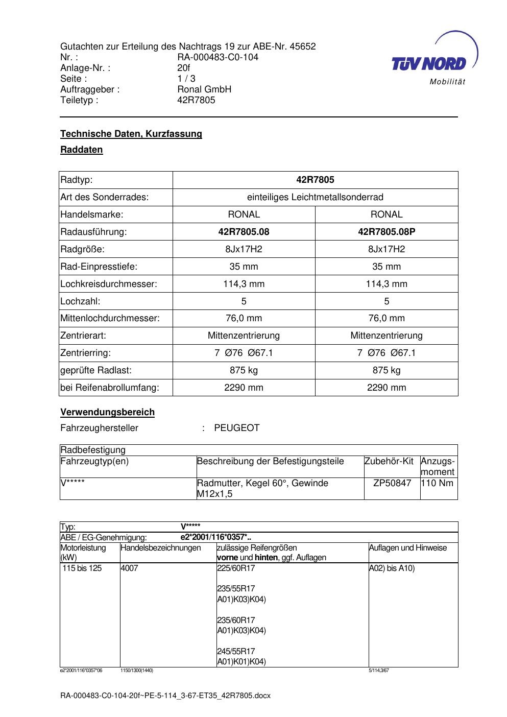 Dieses Gutachten (abe) bezieht sich auf die Alufelge brand-ronal 42R7805 in der Ausführung 8Jx17 ET 0, Mittenloch 0 mm (KBA 45652). Im PDF findest du typischerweise zulässige Reifengrößen, Auflagen/Anbauhinweise und – je nach Dokument – Hinweise zur Eintragung.