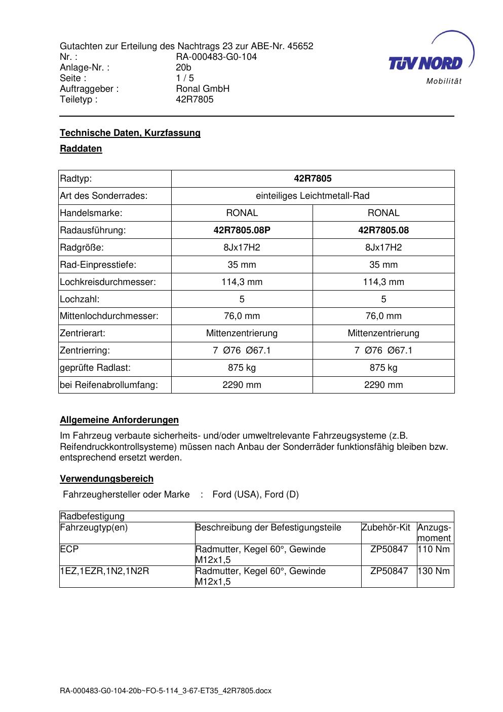 Dieses Gutachten (abe) bezieht sich auf die Alufelge brand-ronal 42R7805 in der Ausführung 8Jx17 ET 0, Mittenloch 0 mm (KBA 45652). Im PDF findest du typischerweise zulässige Reifengrößen, Auflagen/Anbauhinweise und – je nach Dokument – Hinweise zur Eintragung.