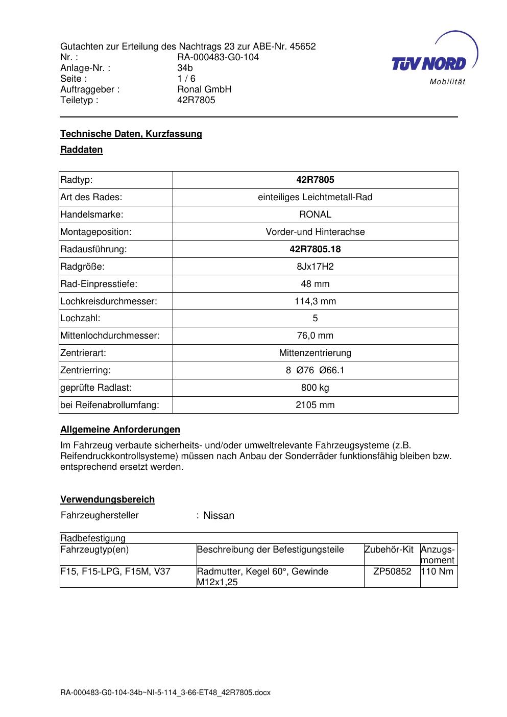 Dieses Gutachten (abe) bezieht sich auf die Alufelge brand-ronal 42R7805 in der Ausführung 8Jx17 ET 0, Mittenloch 0 mm (KBA 45652). Im PDF findest du typischerweise zulässige Reifengrößen, Auflagen/Anbauhinweise und – je nach Dokument – Hinweise zur Eintragung.