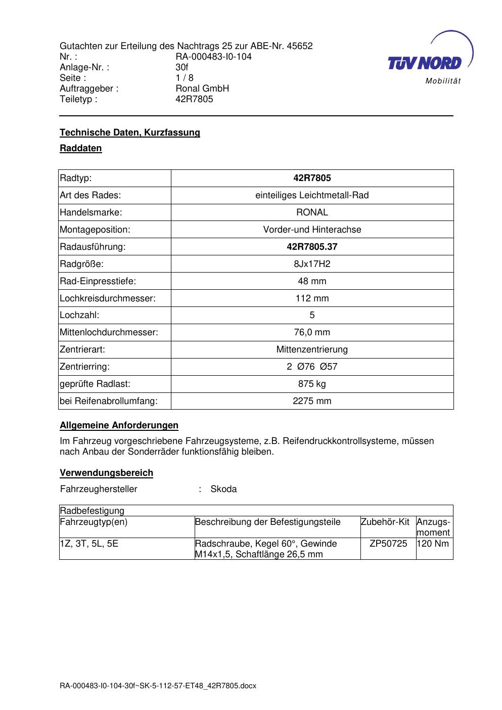 Dieses Gutachten (abe) bezieht sich auf die Alufelge brand-ronal 42R7805 in der Ausführung 8Jx17 ET 0, Mittenloch 0 mm (KBA 45652). Im PDF findest du typischerweise zulässige Reifengrößen, Auflagen/Anbauhinweise und – je nach Dokument – Hinweise zur Eintragung.