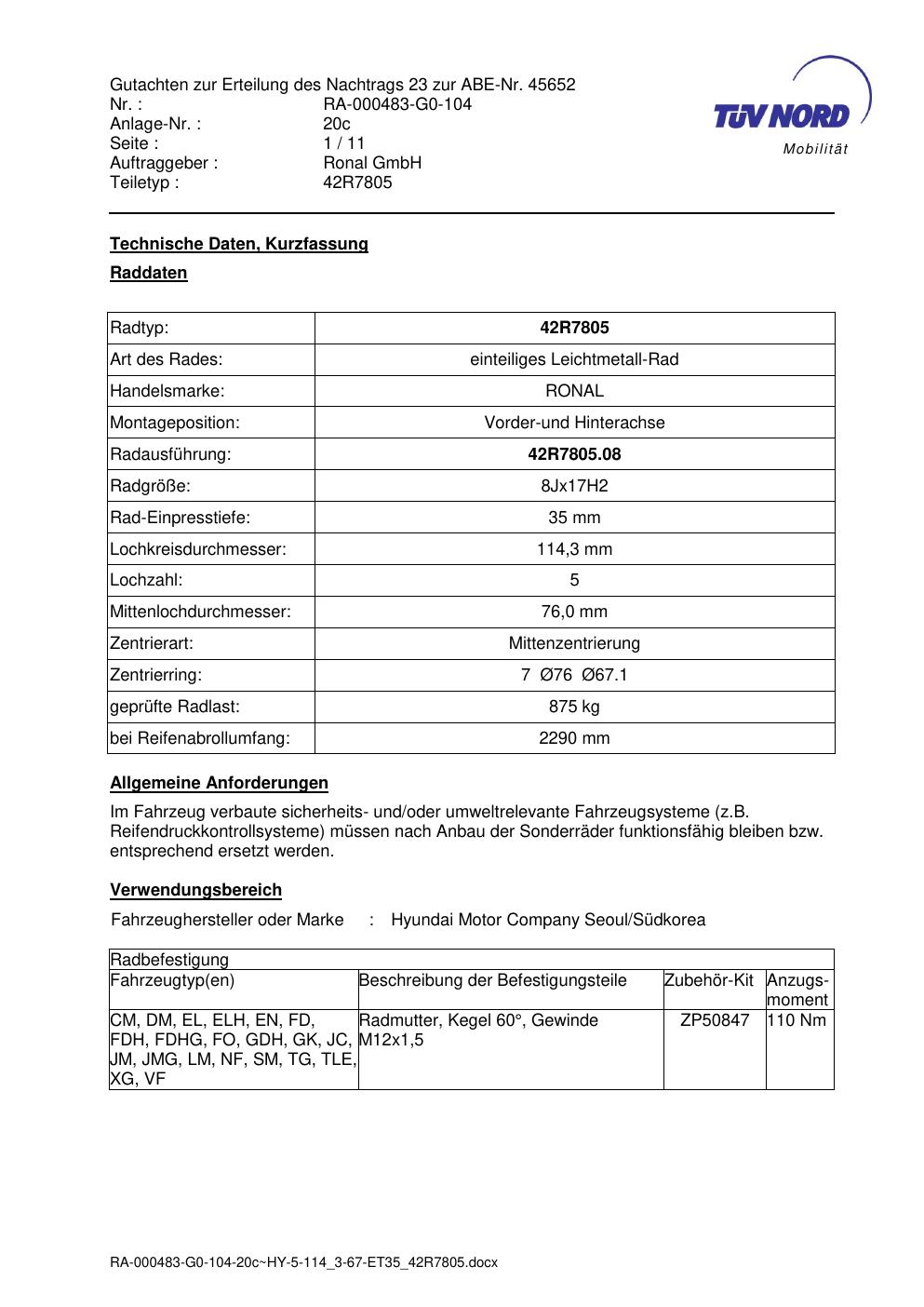 Dieses Gutachten (abe) bezieht sich auf die Alufelge brand-ronal 42R7805 in der Ausführung 8Jx17 ET 0, Mittenloch 0 mm (KBA 45652). Im PDF findest du typischerweise zulässige Reifengrößen, Auflagen/Anbauhinweise und – je nach Dokument – Hinweise zur Eintragung.