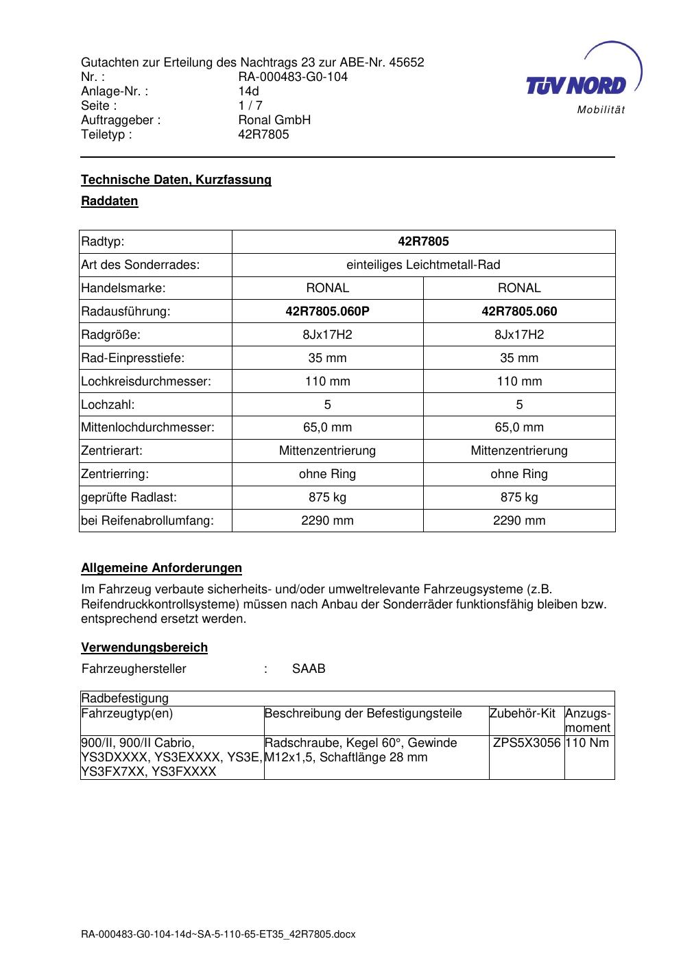 Dieses Gutachten (abe) bezieht sich auf die Alufelge brand-ronal 42R7805 in der Ausführung 8Jx17 ET 0, Mittenloch 0 mm (KBA 45652). Im PDF findest du typischerweise zulässige Reifengrößen, Auflagen/Anbauhinweise und – je nach Dokument – Hinweise zur Eintragung.