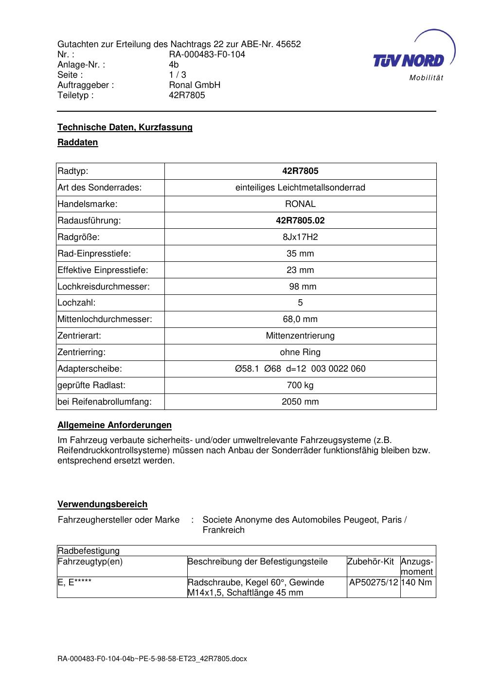 Dieses Gutachten (abe) bezieht sich auf die Alufelge brand-ronal 42R7805 in der Ausführung 8Jx17 ET 0, Mittenloch 0 mm (KBA 45652). Im PDF findest du typischerweise zulässige Reifengrößen, Auflagen/Anbauhinweise und – je nach Dokument – Hinweise zur Eintragung.
