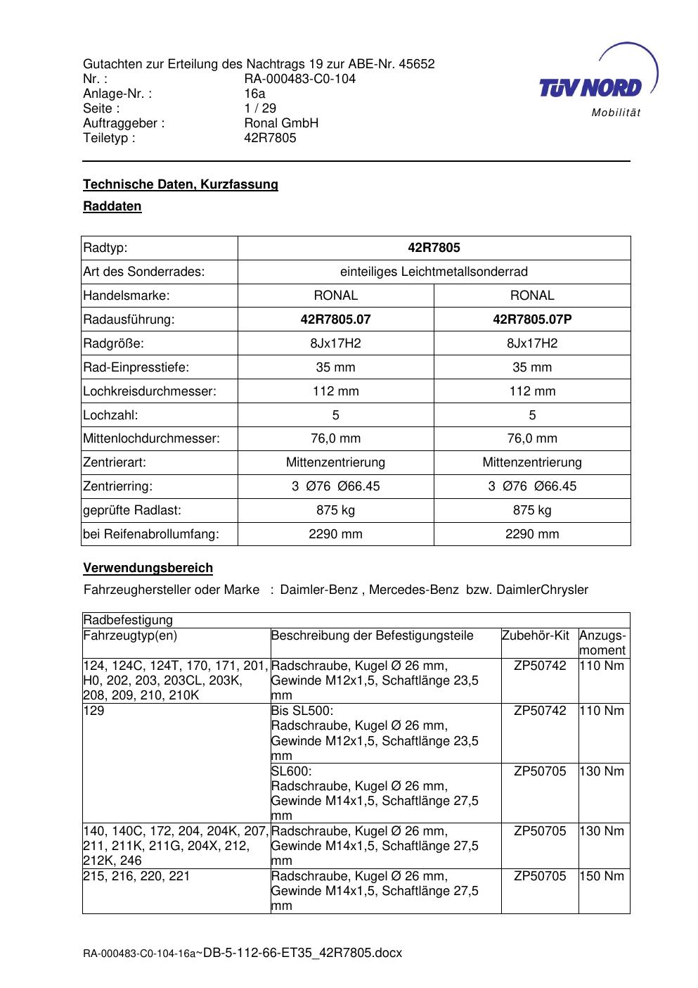 Dieses Gutachten (abe) bezieht sich auf die Alufelge brand-ronal 42R7805 in der Ausführung 8Jx17 ET 0, Mittenloch 0 mm (KBA 45652). Im PDF findest du typischerweise zulässige Reifengrößen, Auflagen/Anbauhinweise und – je nach Dokument – Hinweise zur Eintragung.
