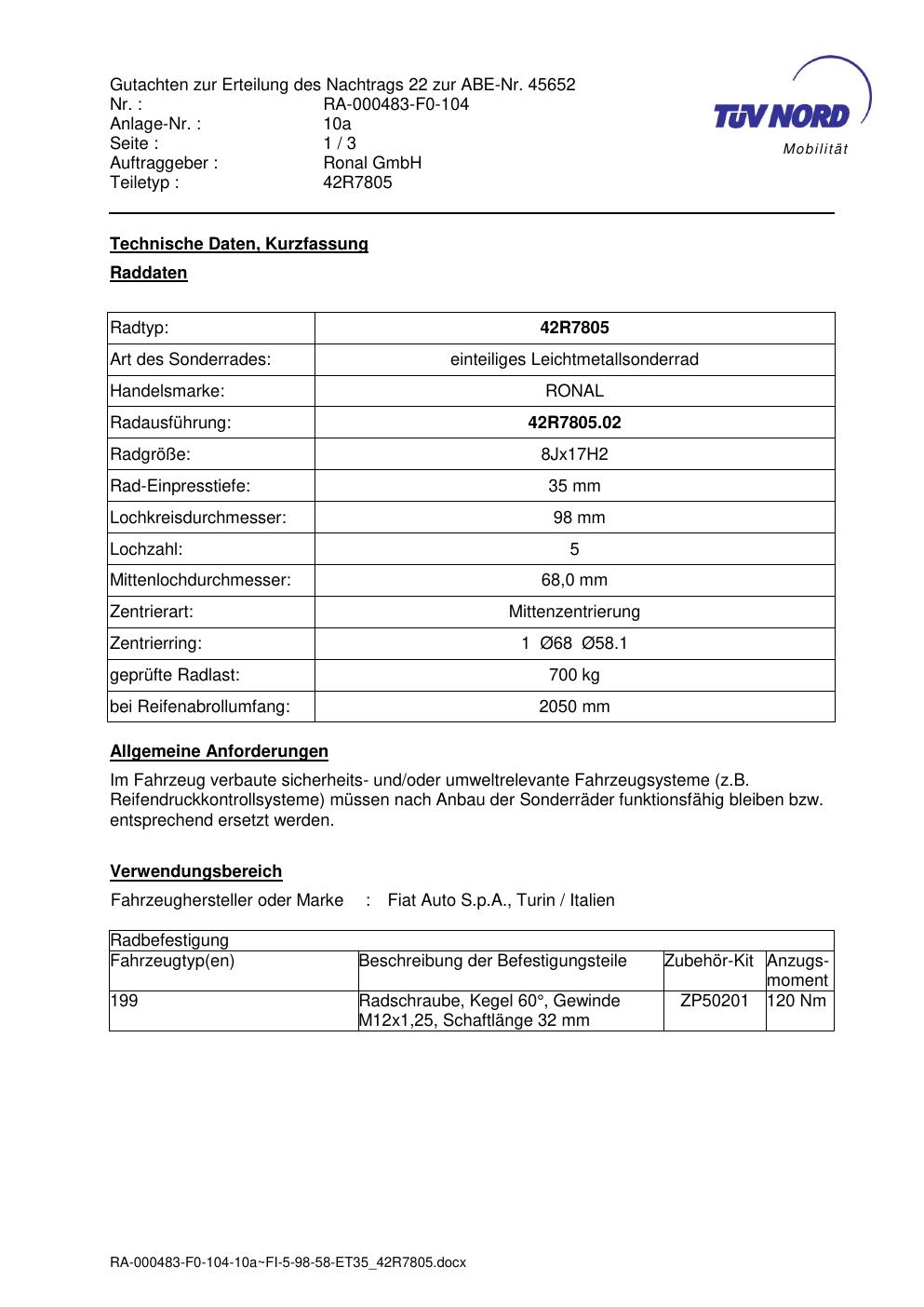 Dieses Gutachten (abe) bezieht sich auf die Alufelge brand-ronal 42R7805 in der Ausführung 8Jx17 ET 0, Mittenloch 0 mm (KBA 45652). Im PDF findest du typischerweise zulässige Reifengrößen, Auflagen/Anbauhinweise und – je nach Dokument – Hinweise zur Eintragung.