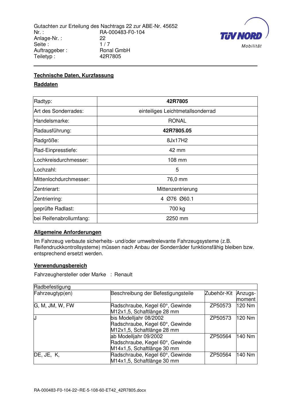 Dieses Gutachten (abe) bezieht sich auf die Alufelge brand-ronal 42R7805 in der Ausführung 8Jx17 ET 0, Mittenloch 0 mm (KBA 45652). Im PDF findest du typischerweise zulässige Reifengrößen, Auflagen/Anbauhinweise und – je nach Dokument – Hinweise zur Eintragung.