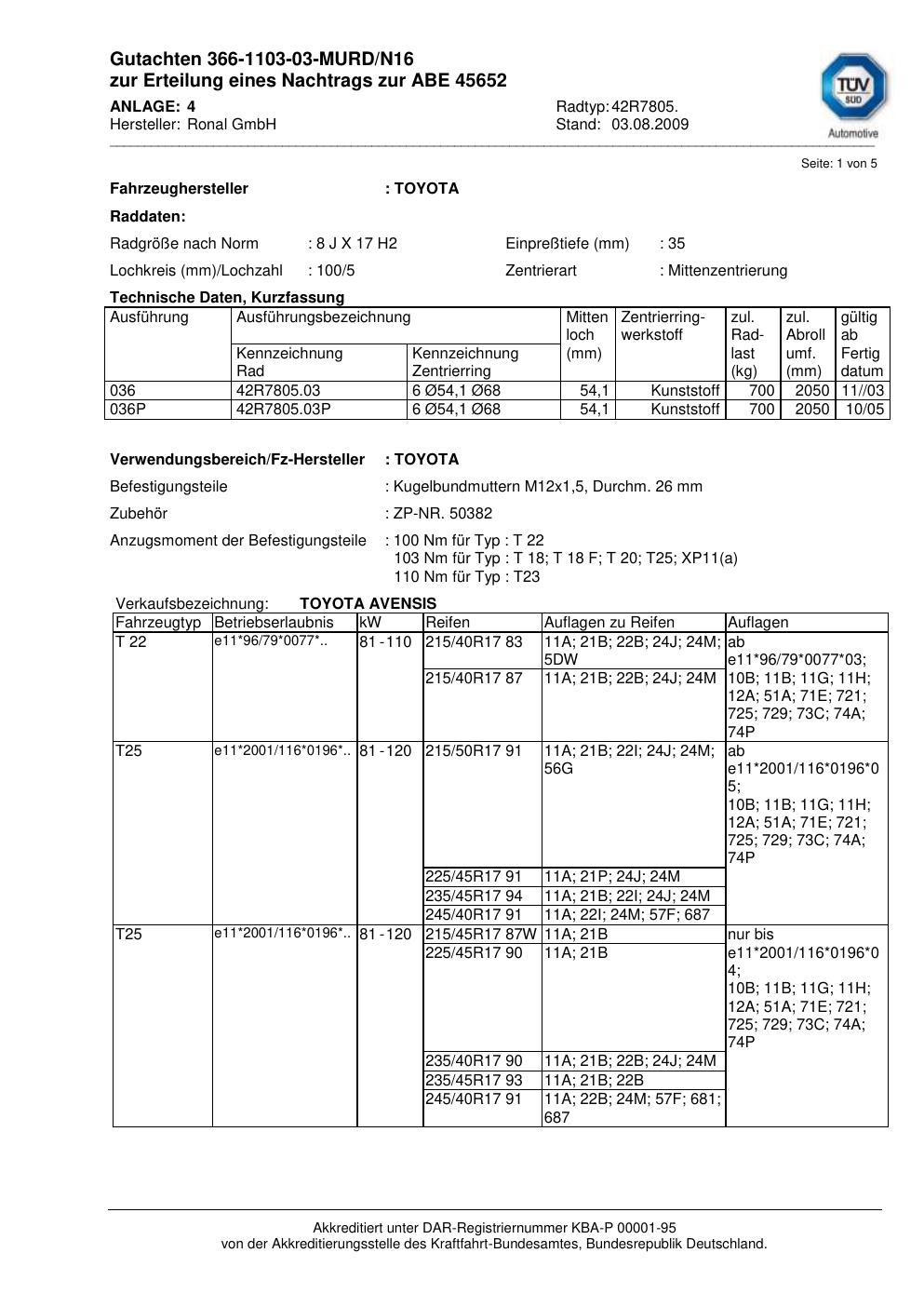 Dieses Gutachten (abe) bezieht sich auf die Alufelge Ronal 42R7805 in der Ausführung 8Jx17 ET 0, Mittenloch 0 mm (KBA 45652). Im PDF findest du typischerweise zulässige Reifengrößen, Auflagen/Anbauhinweise und – je nach Dokument – Hinweise zur Eintragung.