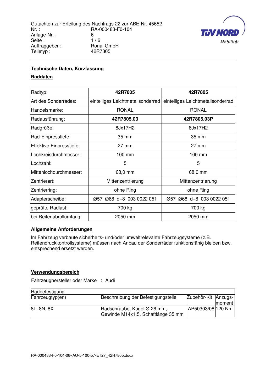 Dieses Gutachten (abe) bezieht sich auf die Alufelge brand-ronal 42R7805 42R7805 in der Ausführung 8Jx17 ET 0, Mittenloch 0 mm (KBA 45652). Im PDF findest du typischerweise zulässige Reifengrößen, Auflagen/Anbauhinweise und – je nach Dokument – Hinweise zur Eintragung.