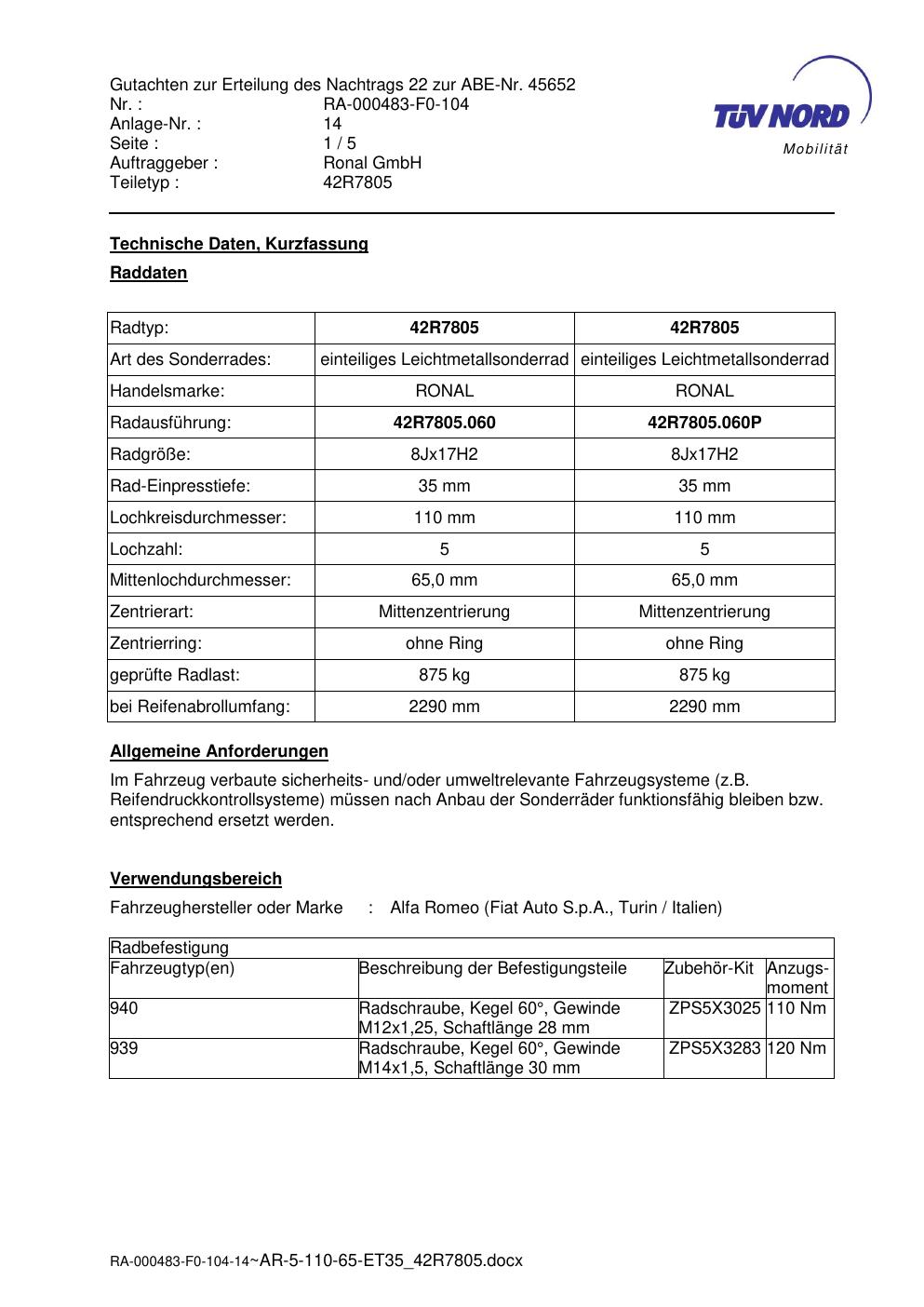 Dieses Gutachten (abe) bezieht sich auf die Alufelge brand-ronal 42R7805 42R7805 in der Ausführung 8Jx17 ET 0, Mittenloch 0 mm (KBA 45652). Im PDF findest du typischerweise zulässige Reifengrößen, Auflagen/Anbauhinweise und – je nach Dokument – Hinweise zur Eintragung.