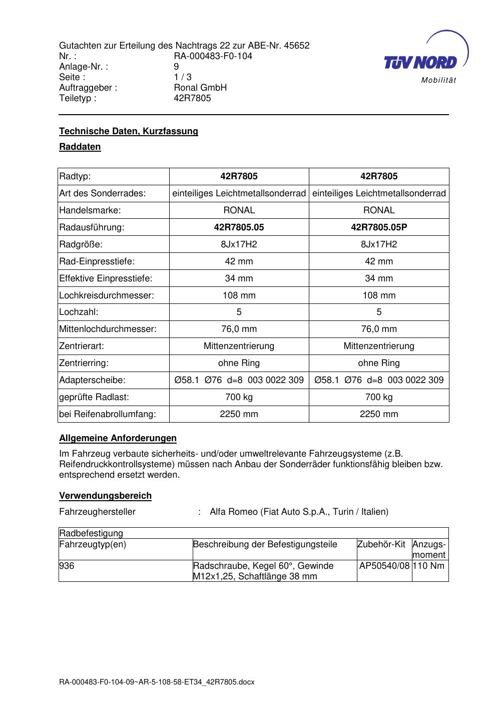 Dieses Gutachten (abe) bezieht sich auf die Alufelge brand-ronal 42R7805 42R7805 in der Ausführung 8Jx17 ET 0, Mittenloch 0 mm (KBA 45652). Im PDF findest du typischerweise zulässige Reifengrößen, Auflagen/Anbauhinweise und – je nach Dokument – Hinweise zur Eintragung.