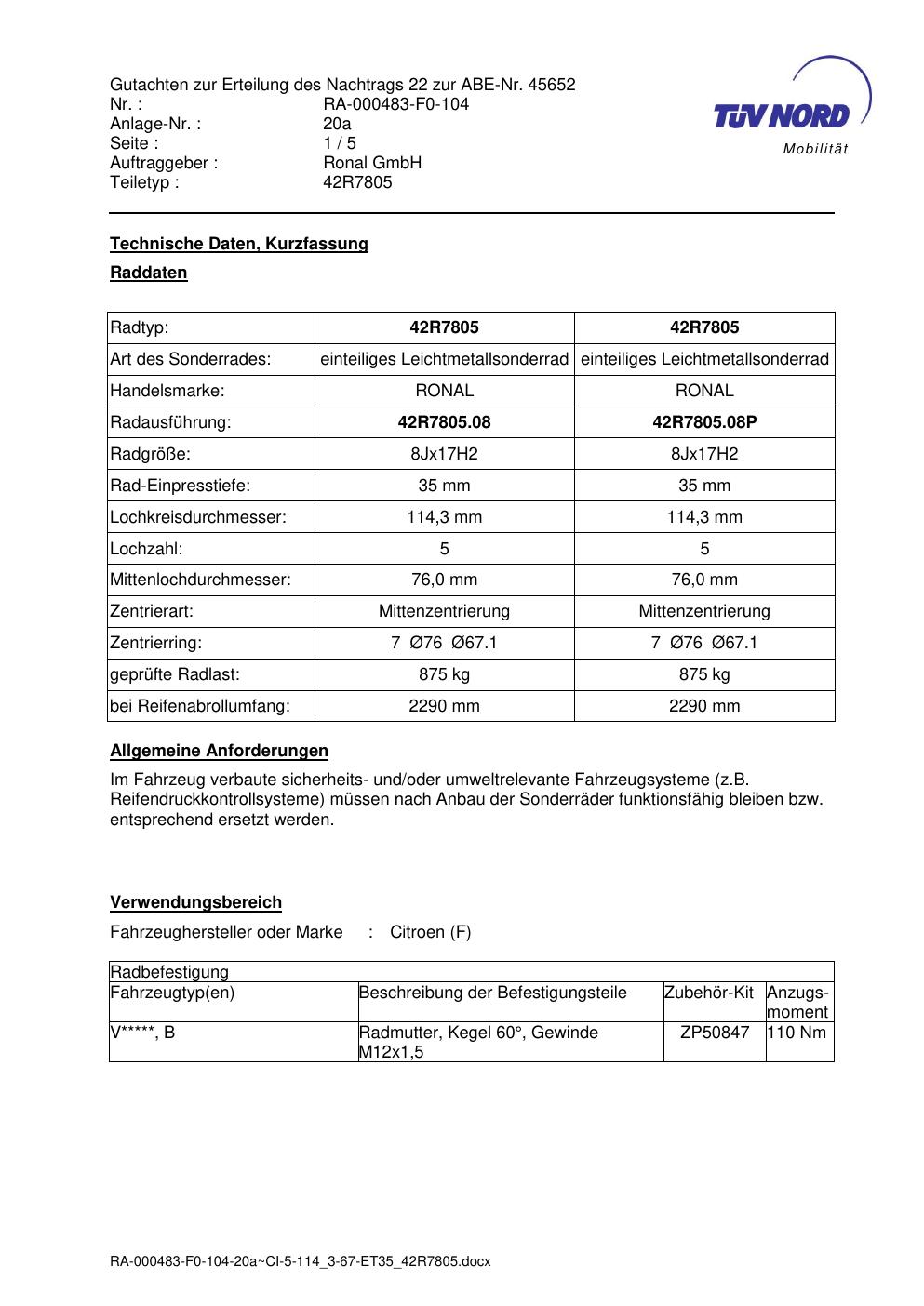 Dieses Gutachten (abe) bezieht sich auf die Alufelge brand-ronal 42R7805 42R7805 in der Ausführung 8Jx17 ET 0, Mittenloch 0 mm (KBA 45652). Im PDF findest du typischerweise zulässige Reifengrößen, Auflagen/Anbauhinweise und – je nach Dokument – Hinweise zur Eintragung.